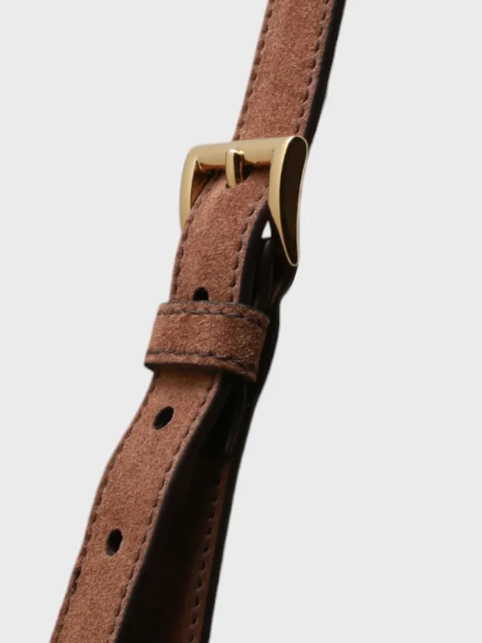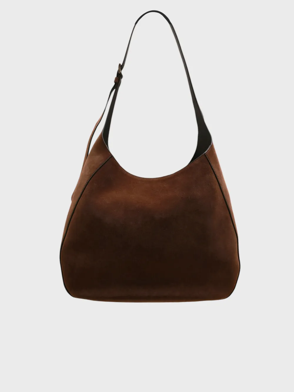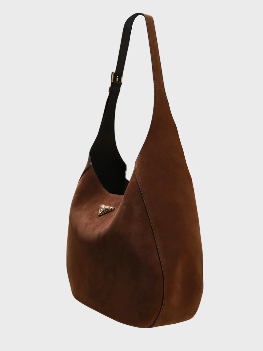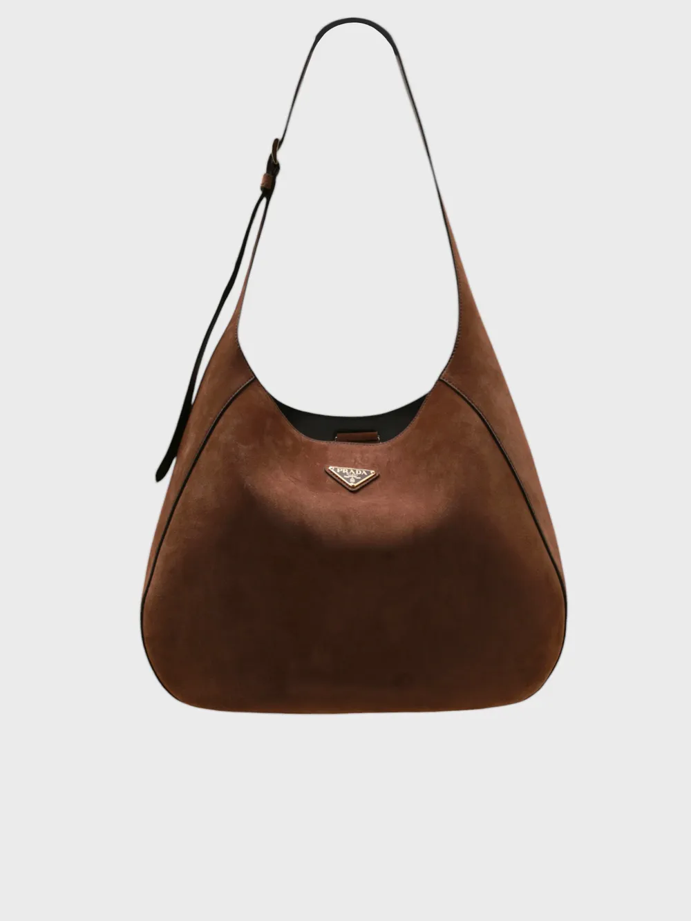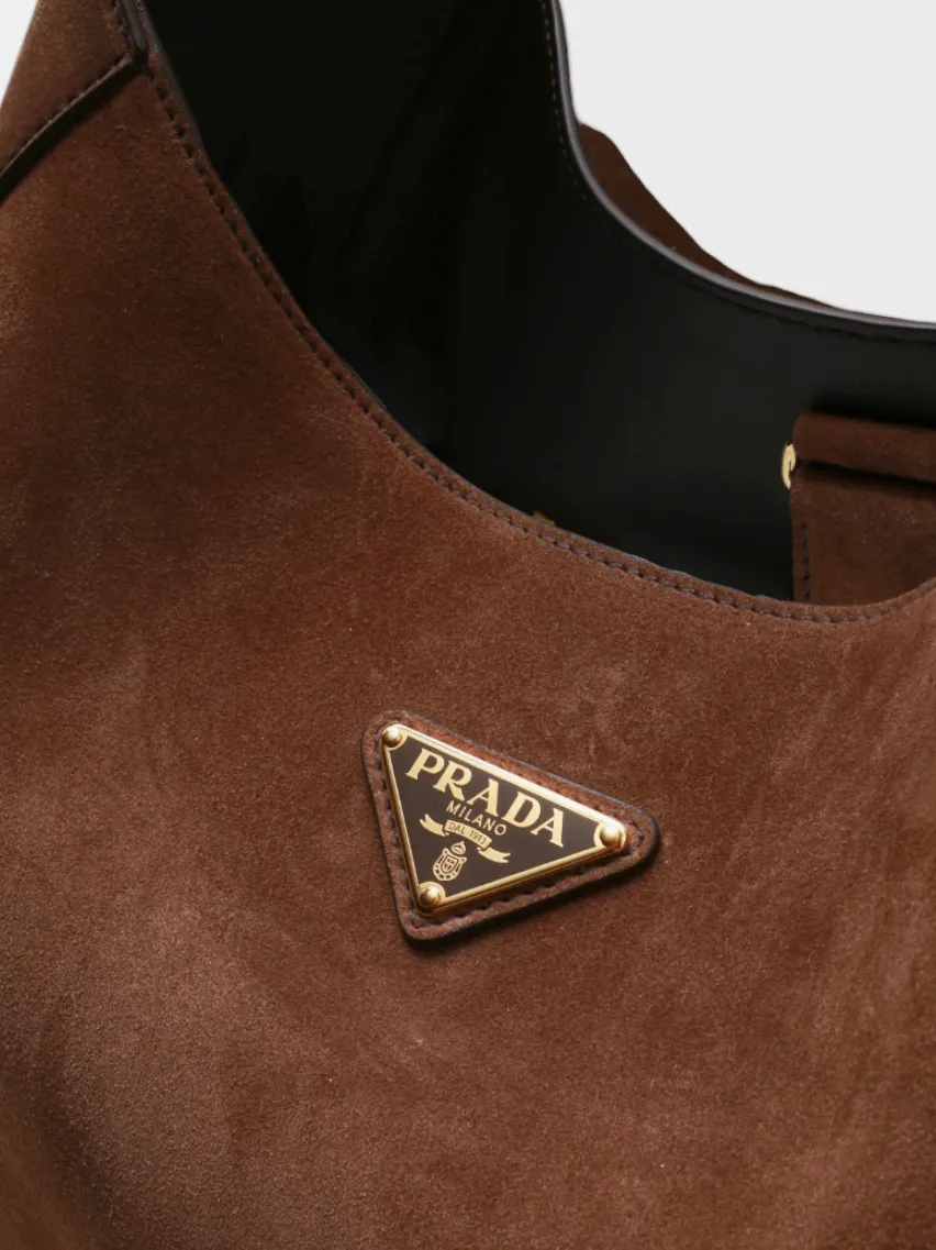 Сумка Prada выполнена из качественной коричневой замши с мягким матовым эффектом и лаконичным дизайном. Модель дополнена широкой регулируемой плечевой лямкой, застежкой-молнией с золотыми деталями и вместительным внутренним отделением. Стильная и универсальная — идеальный аксессуар для повседневного образа.