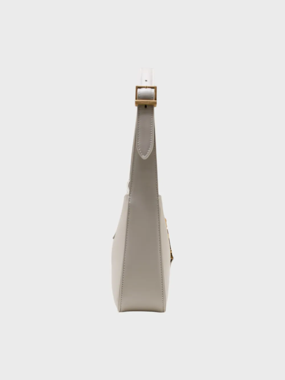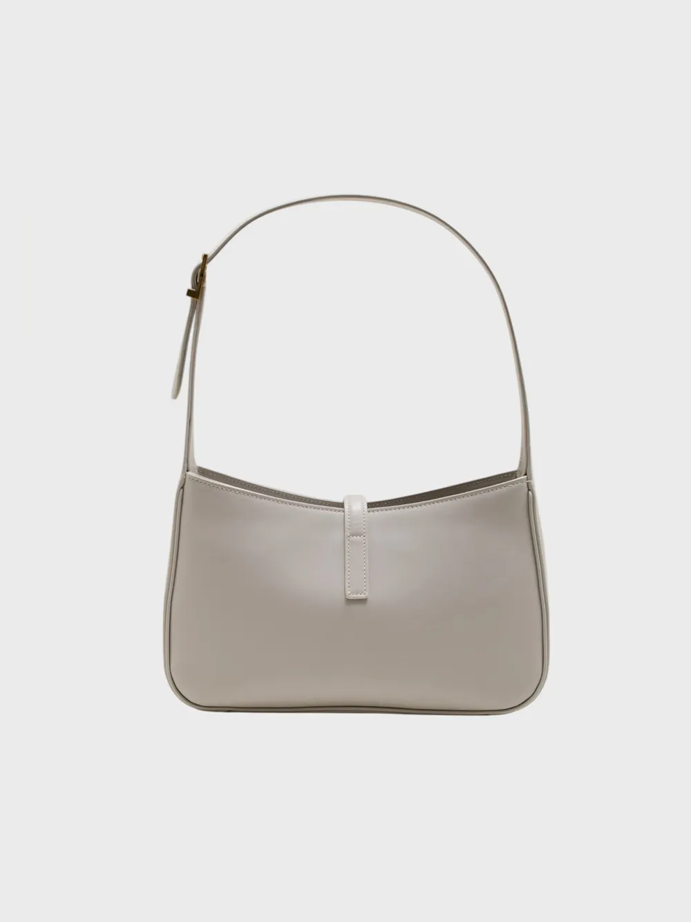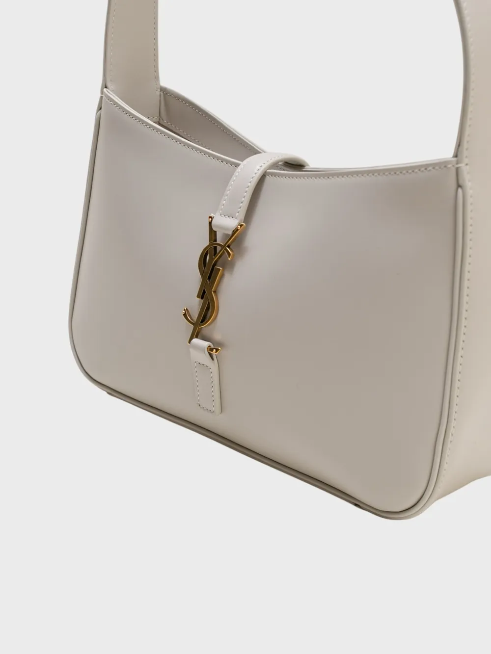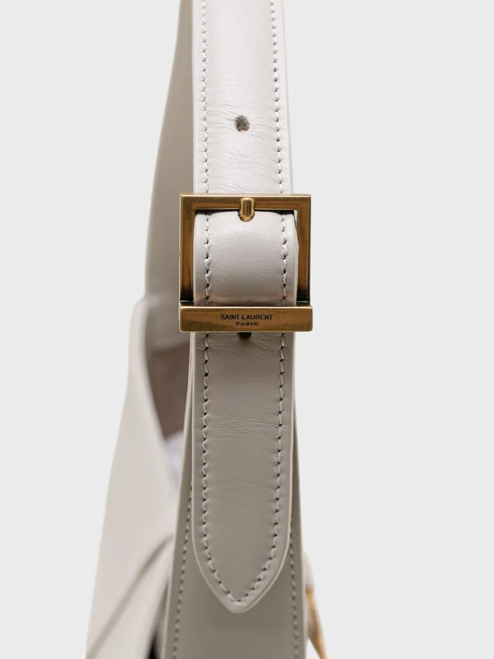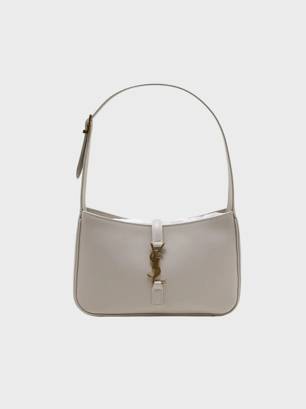 Сумка Saint Laurent выполнена из светло-серой гладкой кожи с минималистичным дизайном. Модель имеет компактную форму и оснащена короткими ручками для ношения на плече или в руке. На передней части сумки расположен фирменный металлический логотип "YSL" в золотом цвете, который добавляет узнаваемость бренда. Внутреннее пространство вместительное, что делает ее универсальной для повседневного использования. Простота дизайна и качество материалов подчеркивают современный стиль бренда.