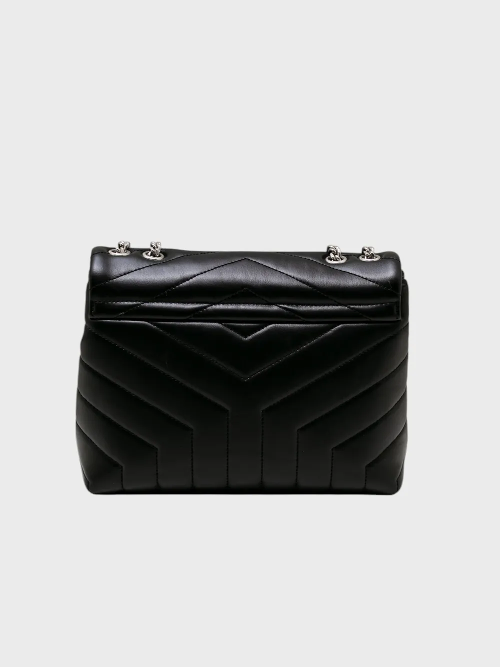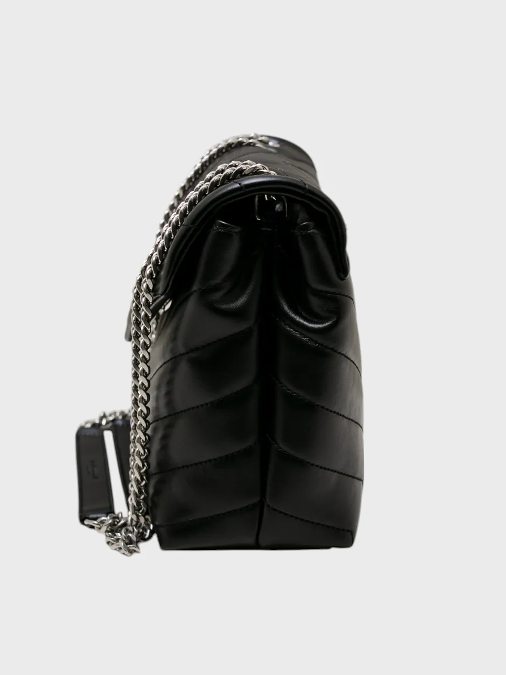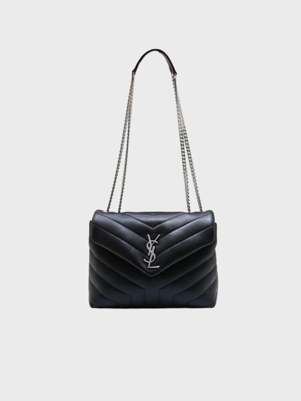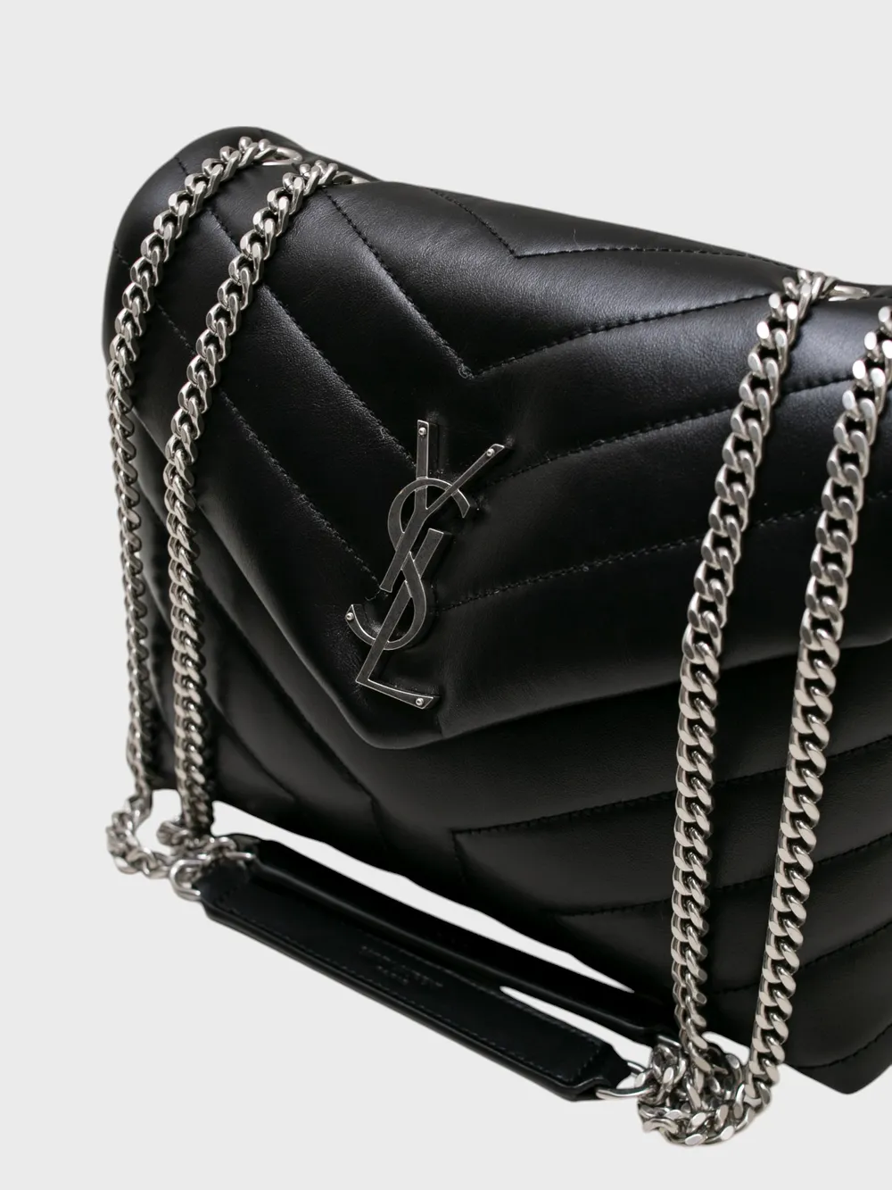 Сумка Saint Laurent выполнена из черной фактурной кожи с эффектом пэчворк, созданным за счет диагональных стежек. Модель дополнена серебристой цепочкой и кожаным ремнем для удобной носки через плечо или на руке. Логотип бренда в виде серебряного монограмма "YSL" украшает переднюю часть сумки, подчеркивая ее премиальность. Застежка-замок обеспечивает безопасное хранение вещей. Современный дизайн и высокое качество материалов делают эту сумку идеальным аксессуаром для повседневного образа или вечернего выхода.