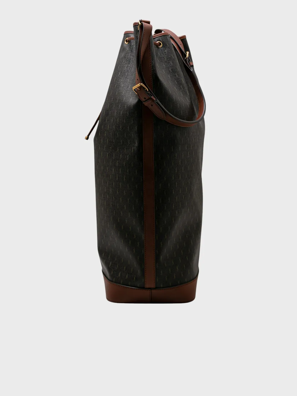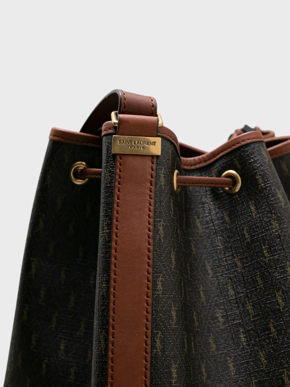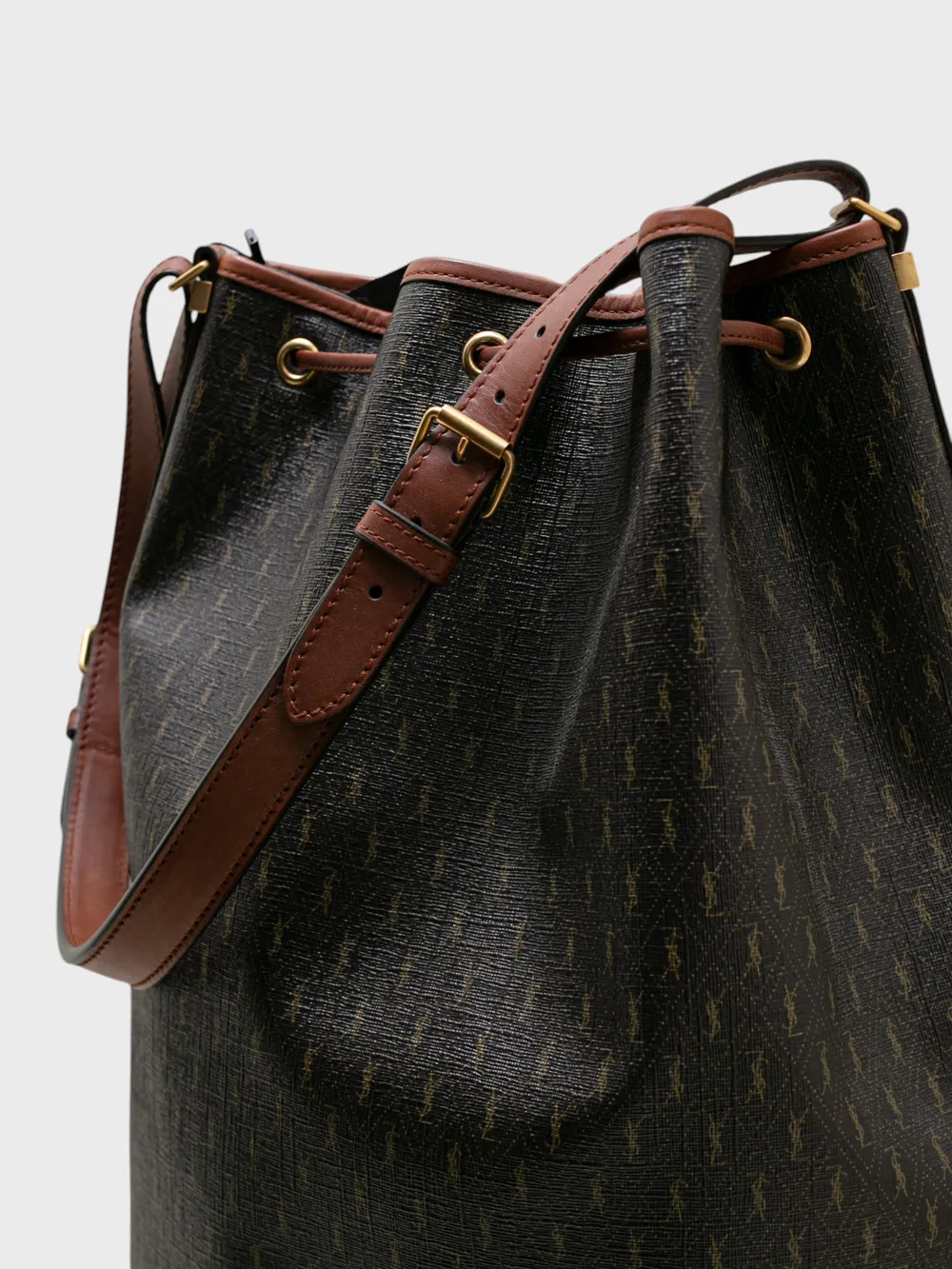Сумка Saint Laurent выполнена из кожи с монограммным принтом в черно-коричневых тонах. Форма дутчера с регулируемым шнурком обеспечивает удобство использования, а кожаные ручки позволяют носить её как на плече, так и в руках. Золотистые детали и фирменная табличка «Saint Laurent Paris» подчеркивают премиальность дизайна. Элегантный аксессуар для повседневного стиля.