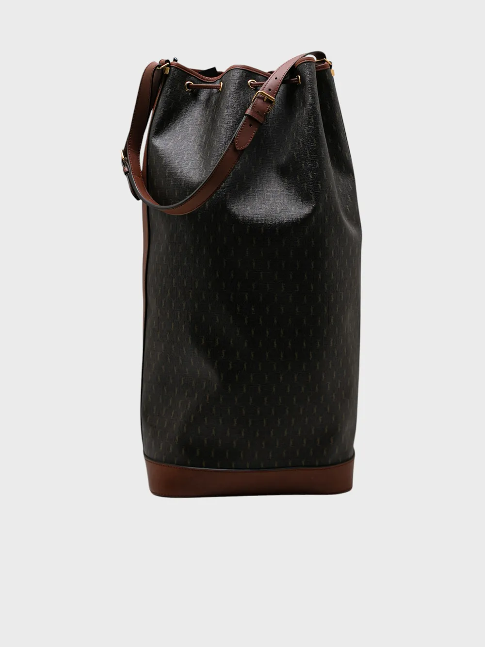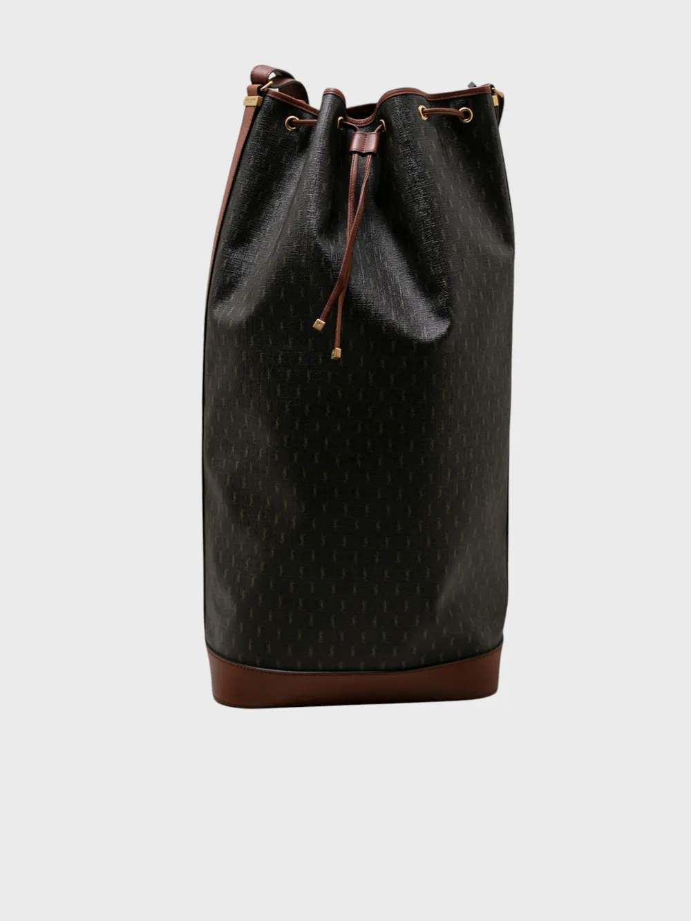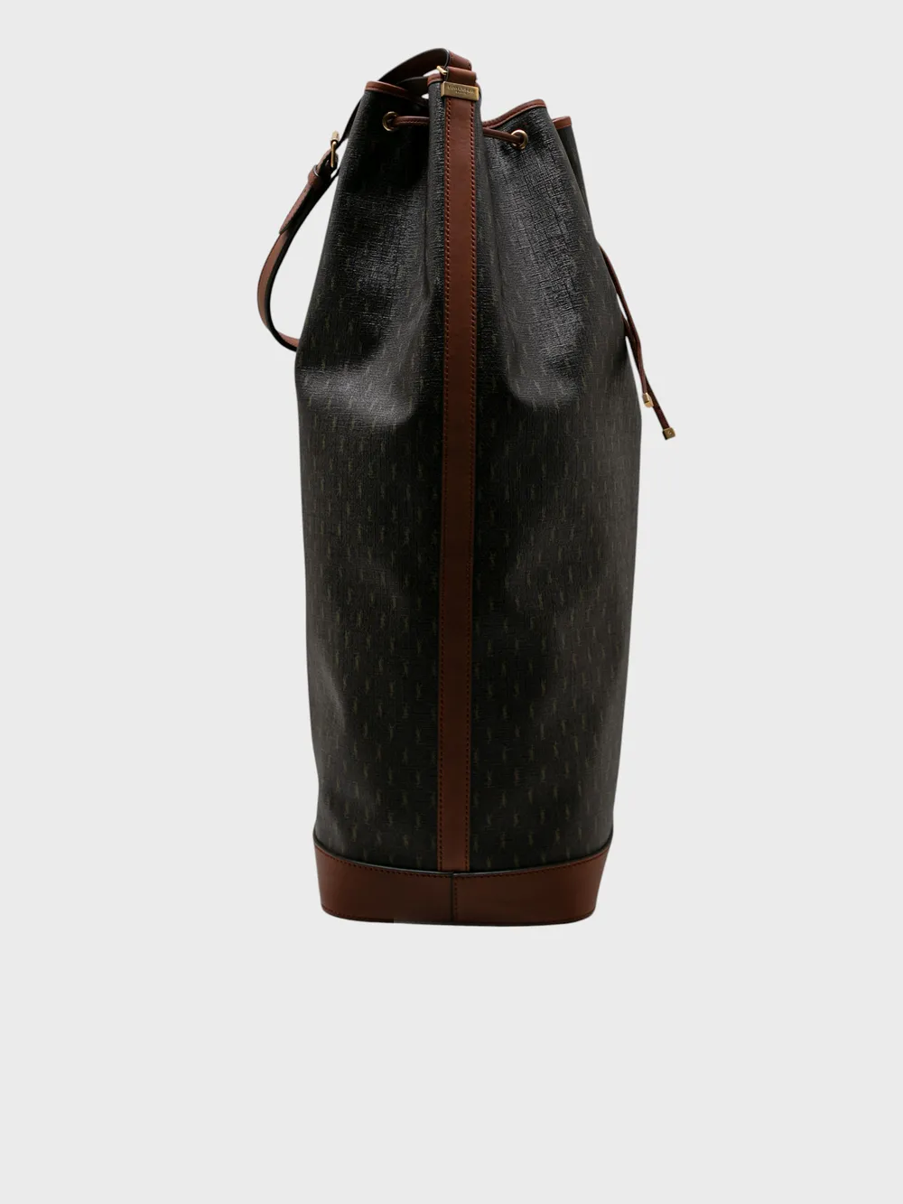 Сумка Saint Laurent выполнена из кожи с монограммным принтом в черно-коричневых тонах. Форма дутчера с регулируемым шнурком обеспечивает удобство использования, а кожаные ручки позволяют носить её как на плече, так и в руках. Золотистые детали и фирменная табличка «Saint Laurent Paris» подчеркивают премиальность дизайна. Элегантный аксессуар для повседневного стиля.