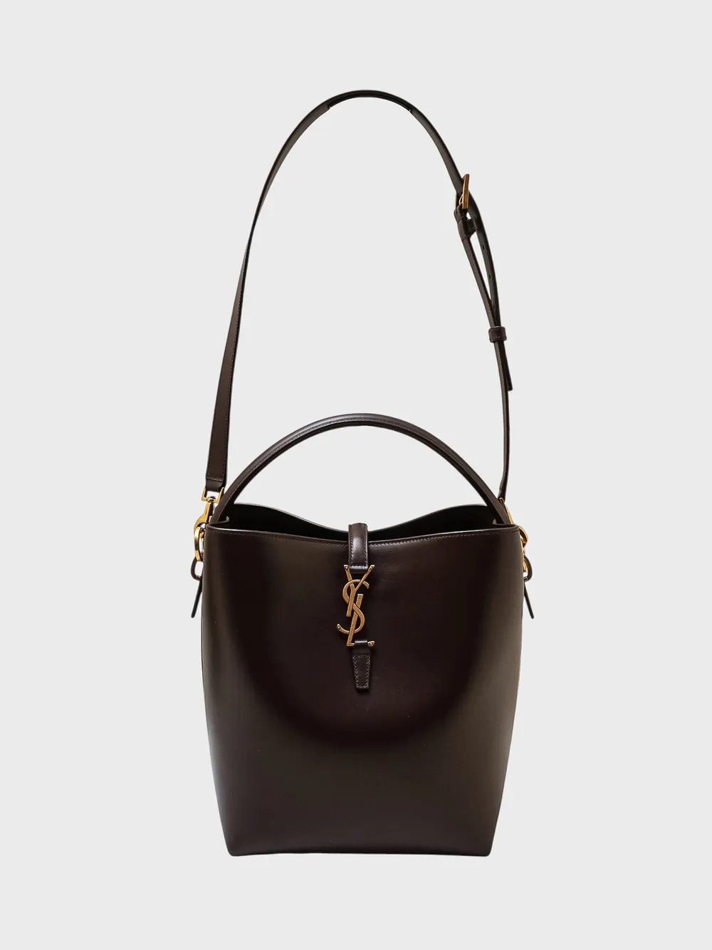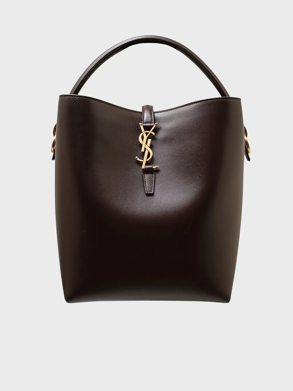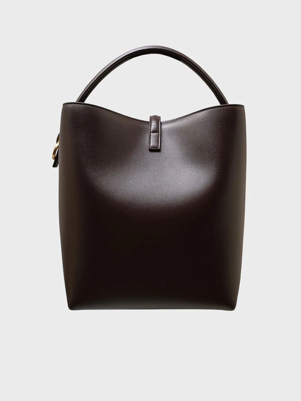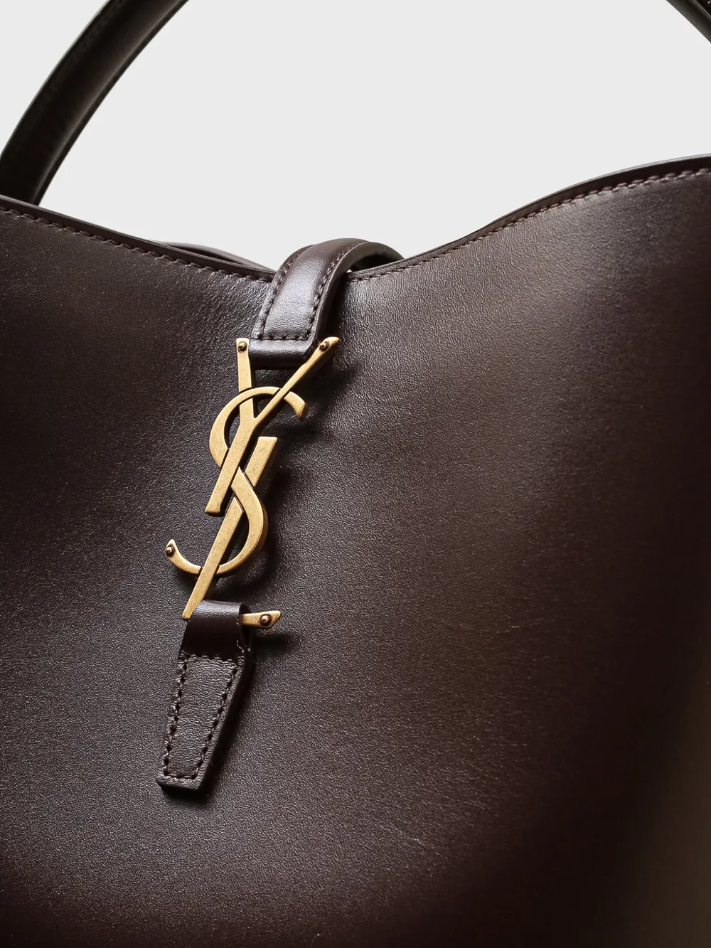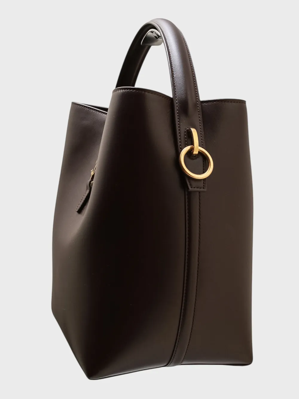Сумка Saint Laurent выполнена из темно-коричневой фактурной кожи с лаконичным дизайном и золотым логотипом бренда. Модель дополнена удобными ручками и металлическими кольцами, обеспечивающими комфортную посадку. Простой и элегантный аксессуар для повседневного образа.
