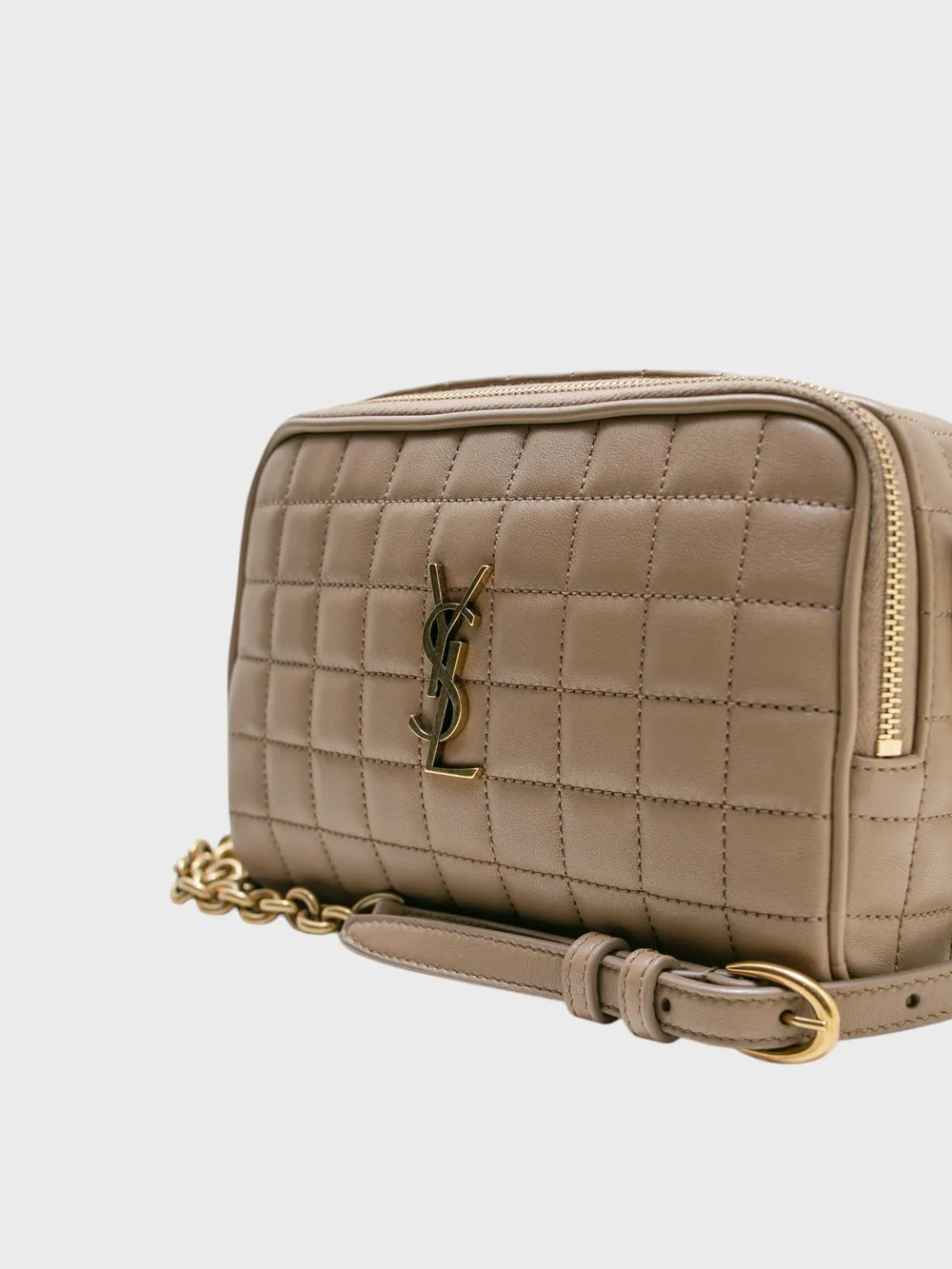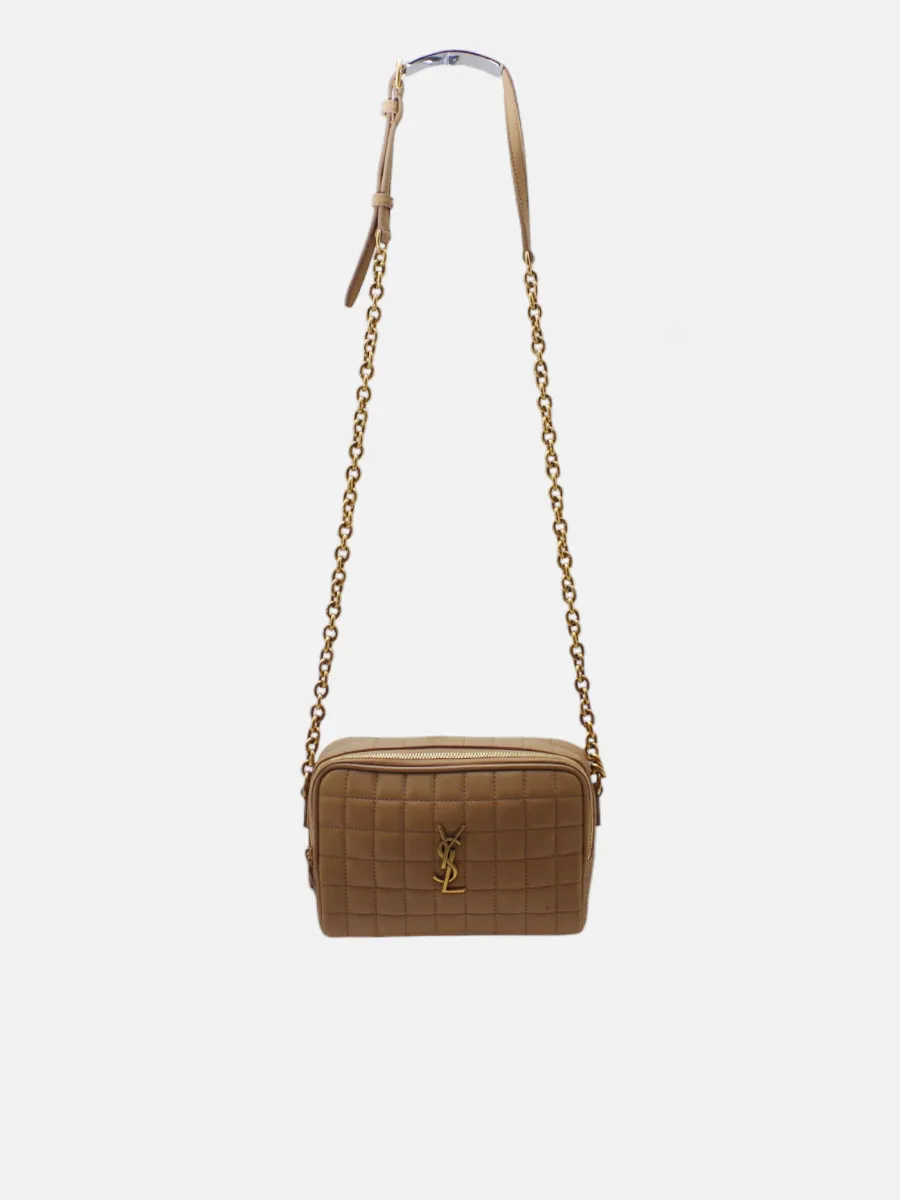 Сумка Saint Laurent выполнена из фактурной кожи в нежно-бежевом оттенке с эффектом пэчворк, созданным за счет квадратных стежек. Модель дополнена золотой цепочкой и кожаным ремнем для удобной носки через плечо или на руке. Логотип бренда в виде золотого монограмма "YSL" украшает переднюю часть сумки, подчеркивая ее премиальность. Застежка-молния обеспечивает безопасное хранение вещей. Современный дизайн и высокое качество материалов делают эту сумку идеальным аксессуаром для повседневного образа или вечернего выхода.