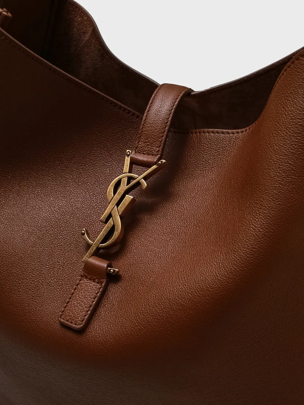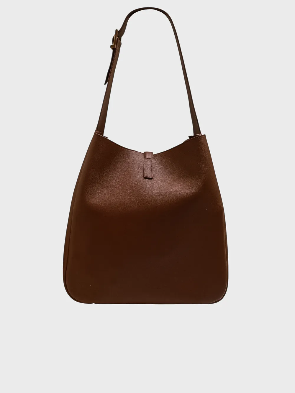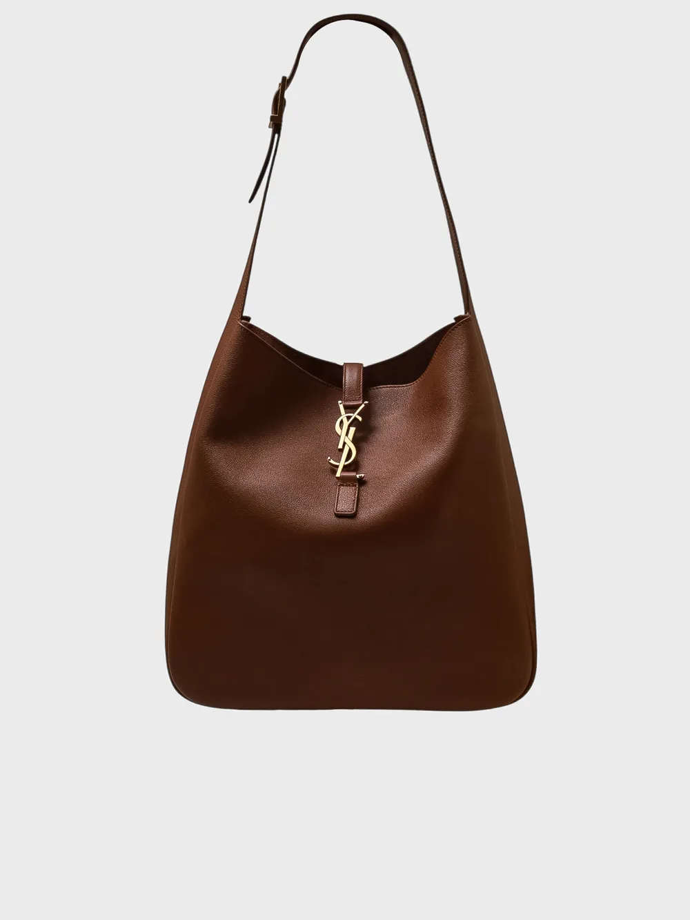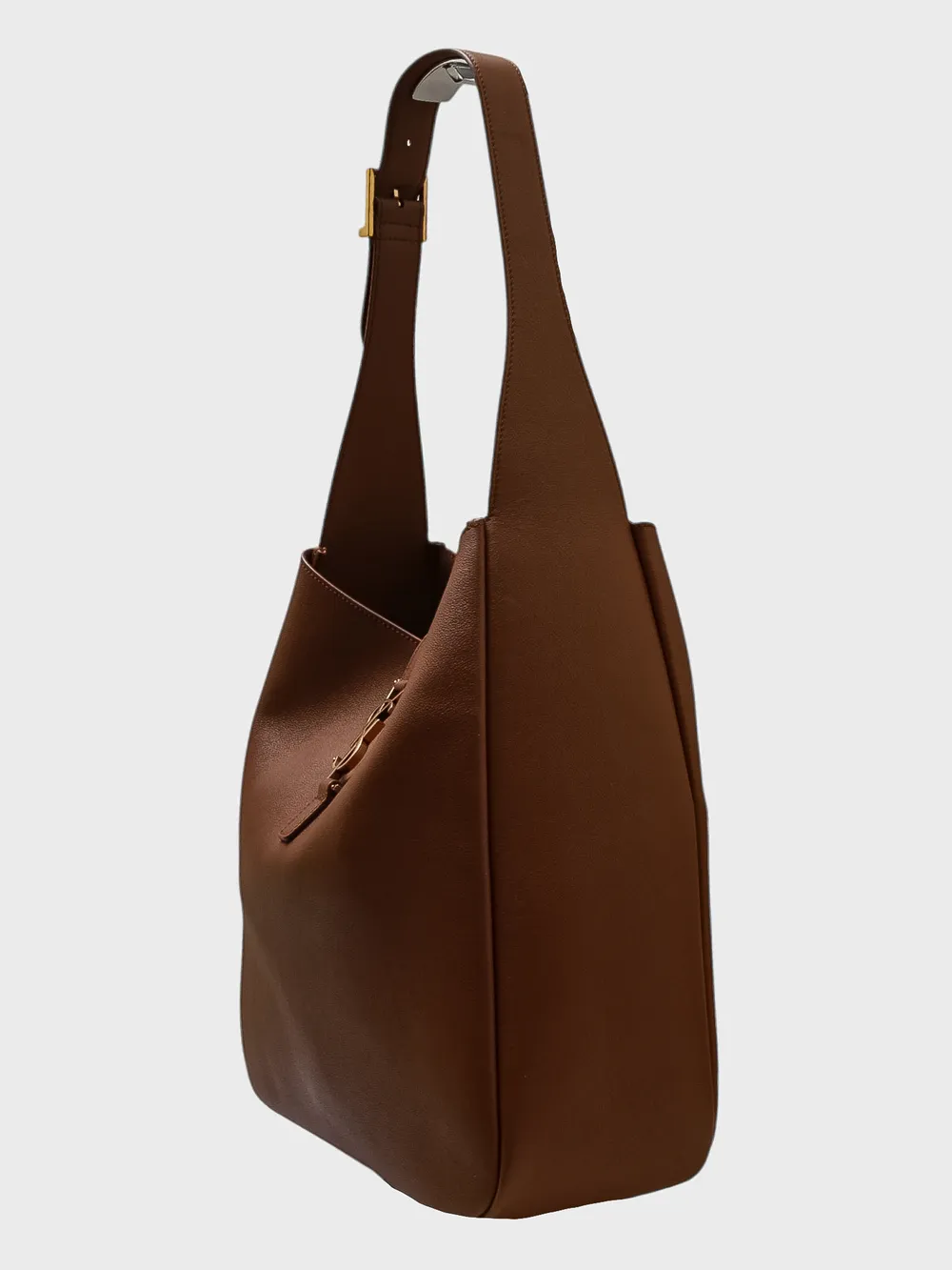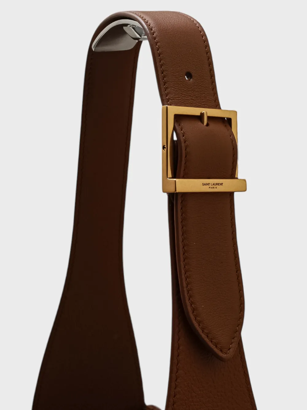 Сумка Saint Laurent выполнена из качественной коричневой кожи с текстурой, придающей изделию естественный вид. Модель дополнена длинной регулируемой ручкой для ношения через плечо и металлическими деталями в золотистом цвете. На лицевой стороне размещено фирменное название бренда "Saint Laurent Paris" и эмблема YSL. Простой силуэт и минималистичный стиль делают аксессуар универсальным для повседневного использования или вечерних выходов.