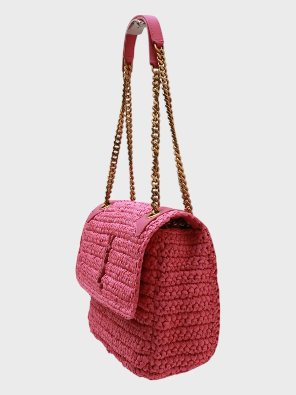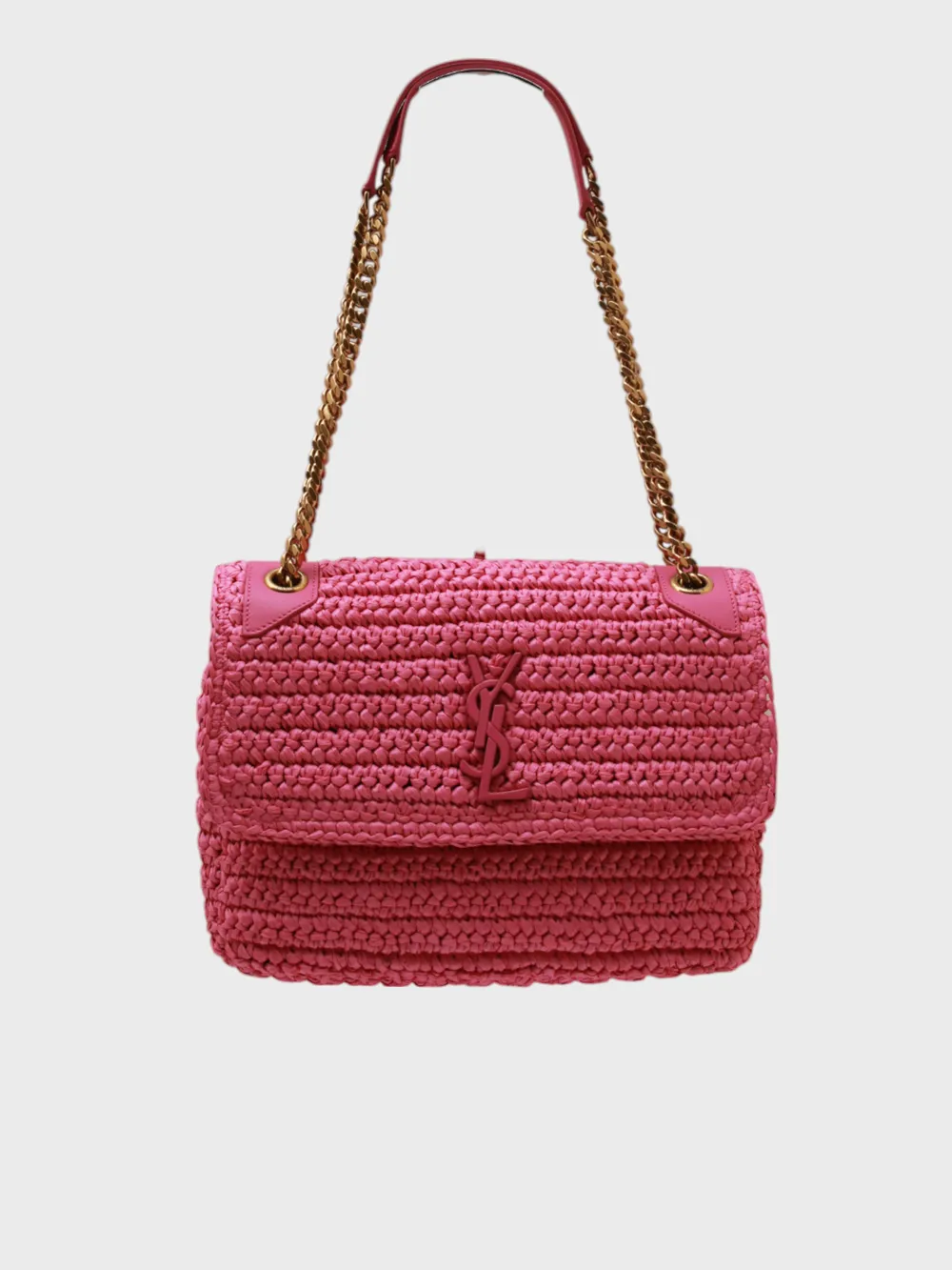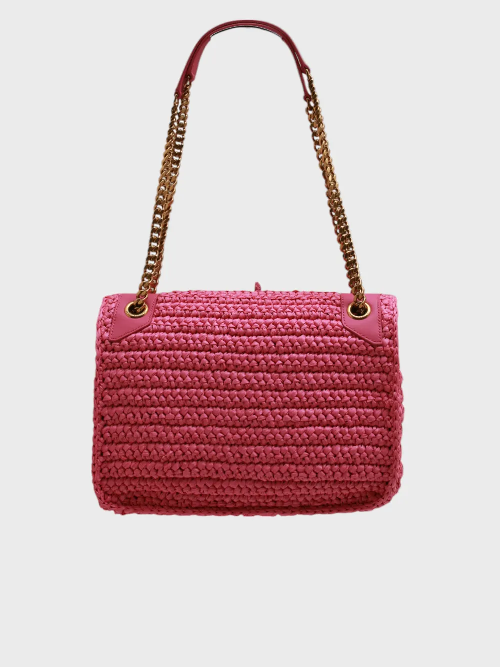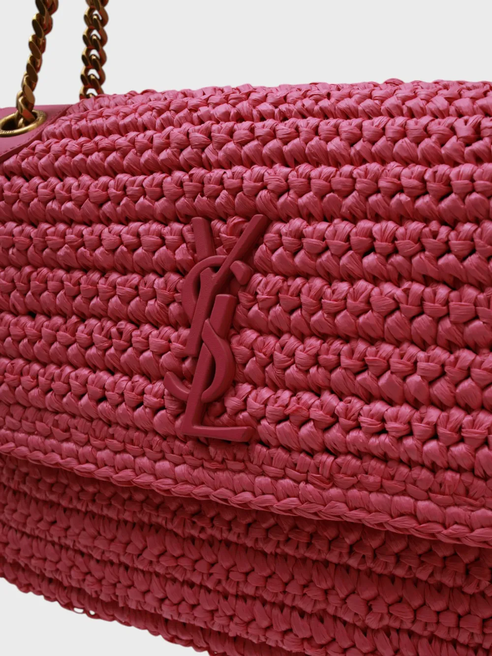 Сумка Saint Laurent выполнена из ярко-розового плетеного ротанга. Модель сочетает компактный прямоугольный силуэт и длинную регулируемую цепочку для ношения через плечо или на запястье. Фронтальная часть декорирована фирменным логотипом "YSL" в металлической отделке, придающим изделию узнаваемость бренда. Внутри сумки просторное отделение с молнией, обеспечивающее надежное хранение вещей. Идеально для повседневного использования или отдыха на природе.
