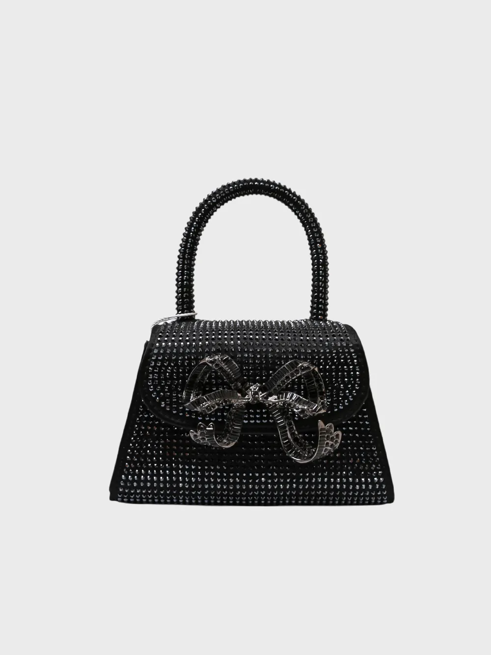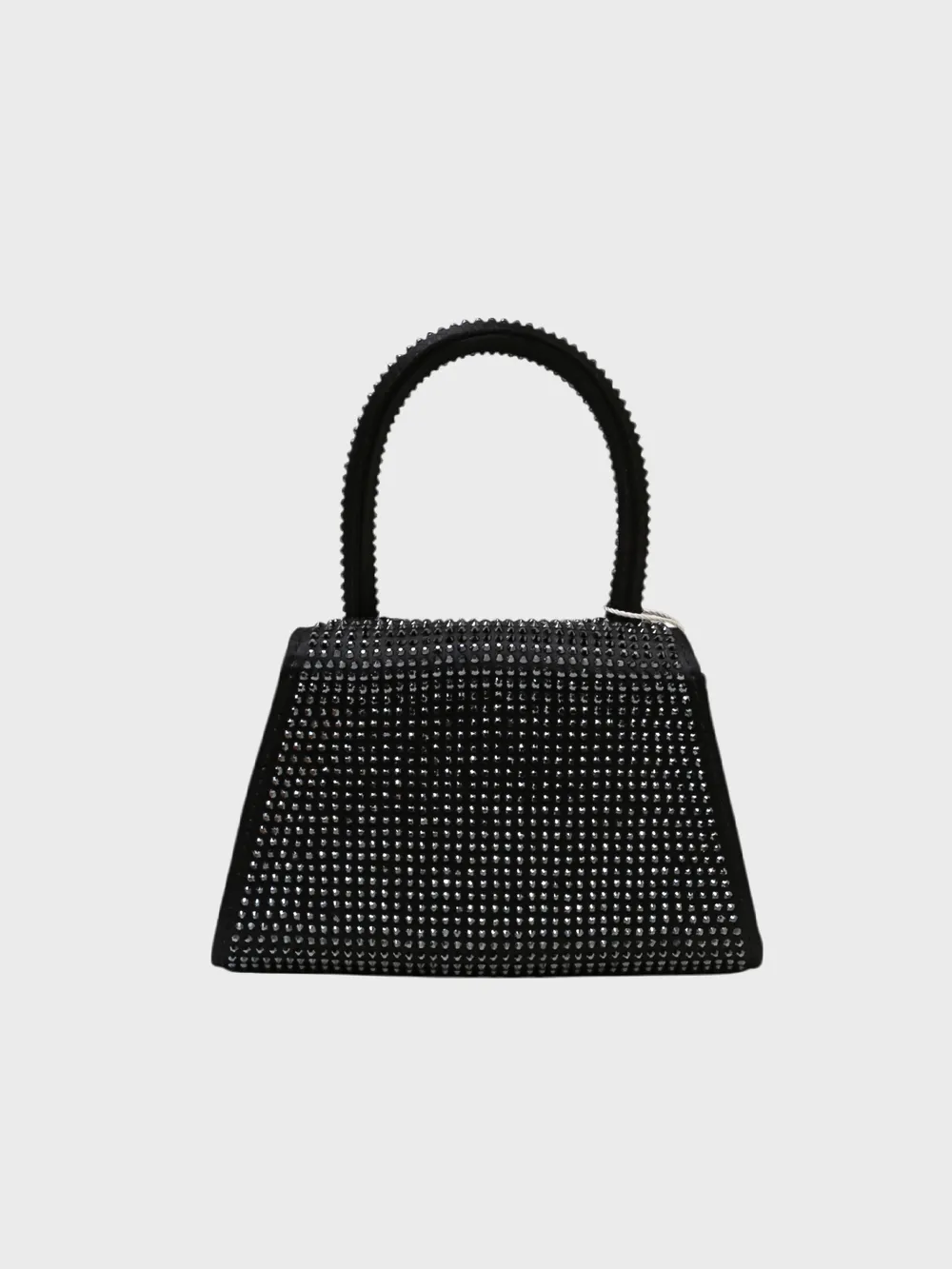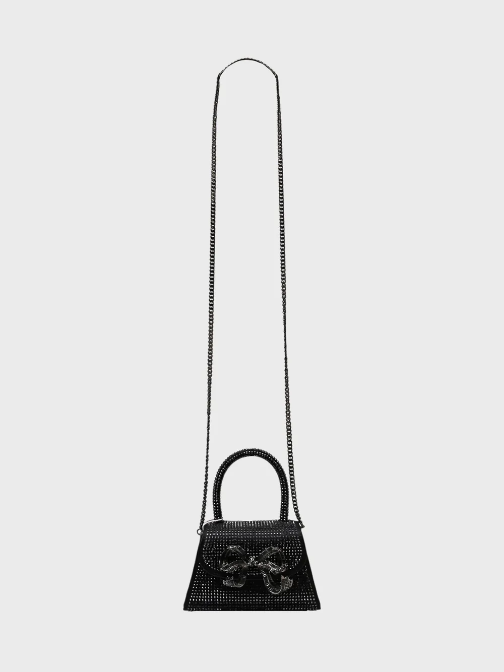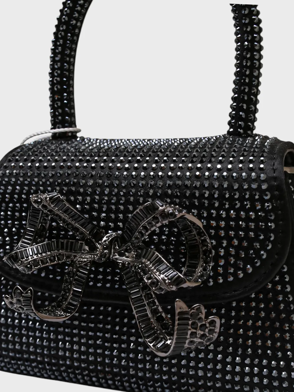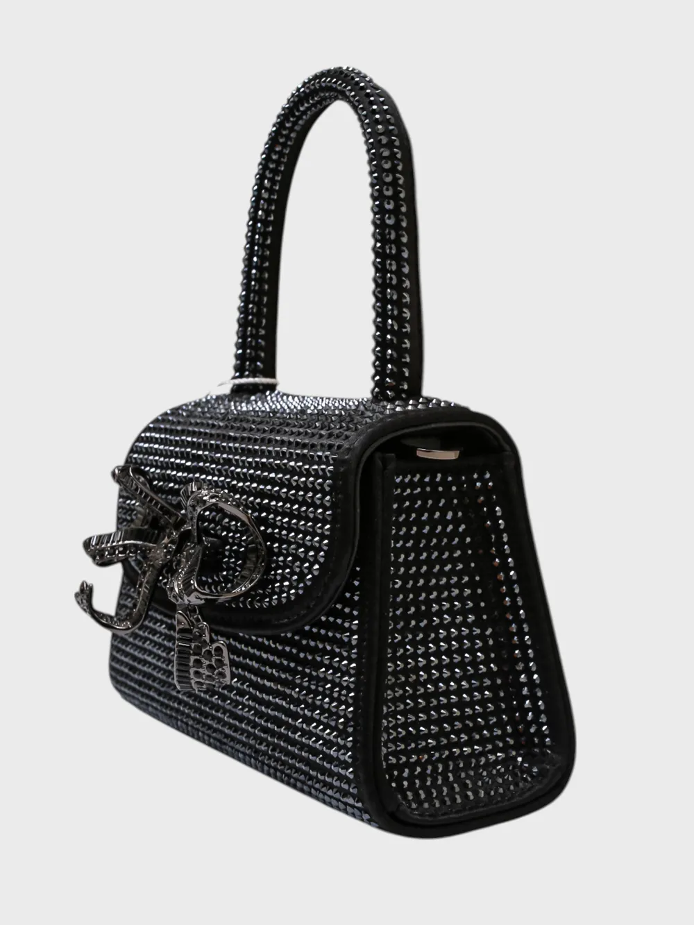 Сумка Self-Portrait выполнена из черной кожи с эффектом перламутра, покрытой плотным узором из блестящих кристаллов, создающих потрясающий мерцающий эффект. Модель дополнена массивным декоративным элементом в виде крупного логотипа бренда, украшенного дополнительными камнями, который становится центральным акцентом дизайна. Классический прямоугольный силуэт и удобная ручка обеспечивают стильный и функциональный внешний вид, идеально подходящий для вечерних мероприятий или особенных случаев.