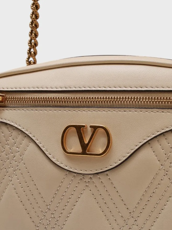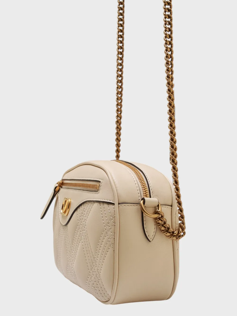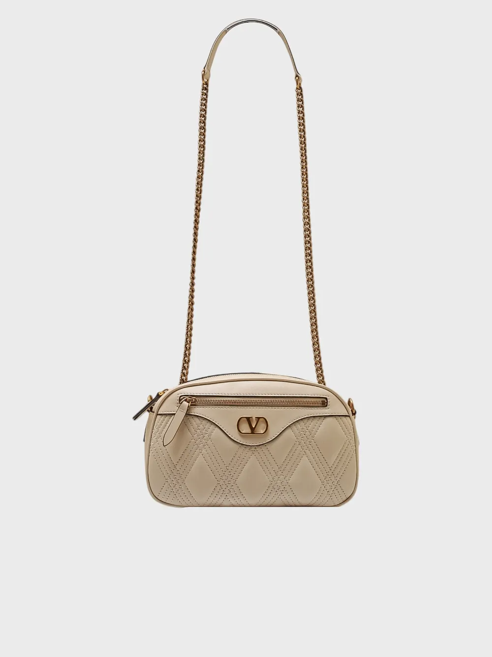 Сумка Valentino выполнена из качественной натуральной кожи с эффектом квадратной стежки, придающей изделию текстуру и визуальную глубину. Модель дополнена золотистой цепью средней толщины, которая обеспечивает комфортное ношение на плече или через плечо. Застежка-молния надежно закрывает внутреннее отделение, оснащенное несколькими карманами для удобства хранения мелочей. Логотип бренда Valentino выполнен в виде фирменного золотого клевера, который является неотъемлемым элементом дизайна. Стильная и элегантная сумка идеально подходит как для повседневных прогулок, так и для деловых встреч.