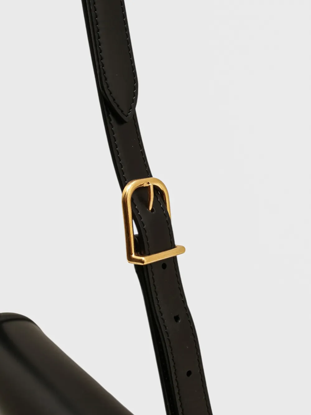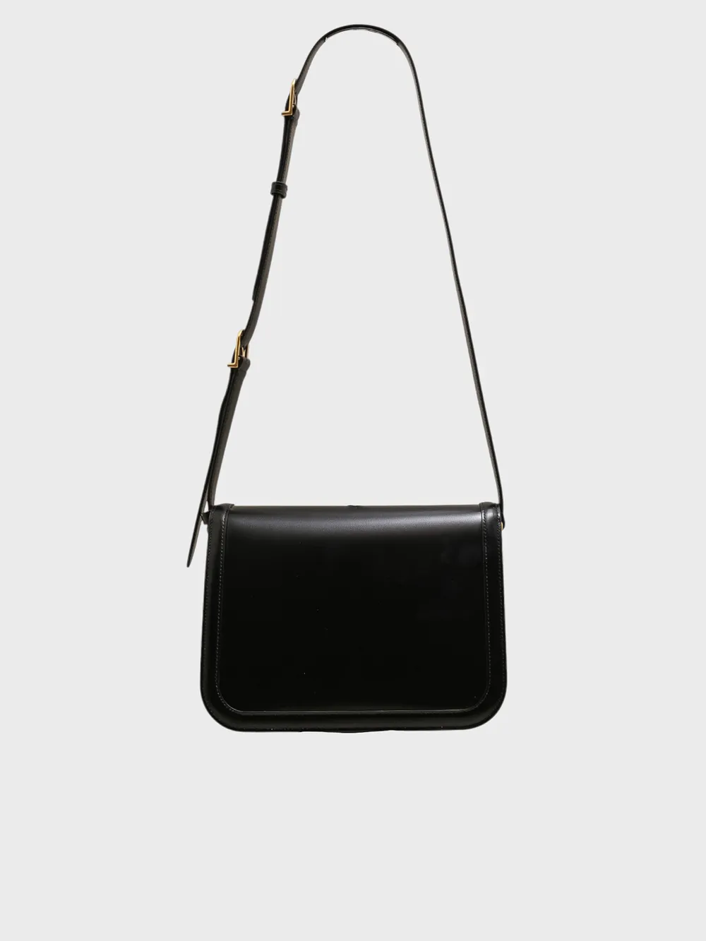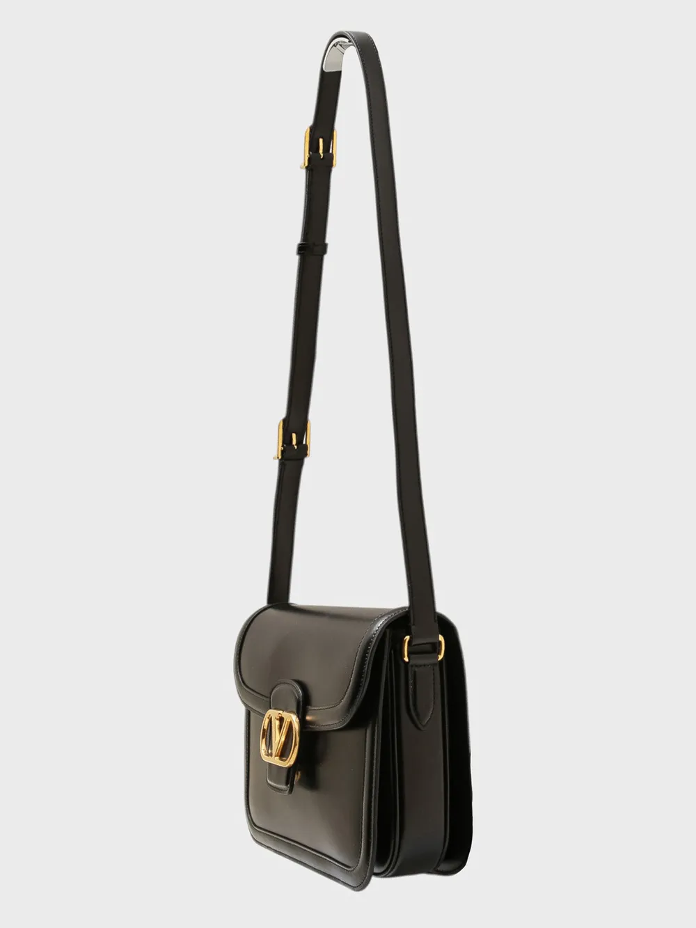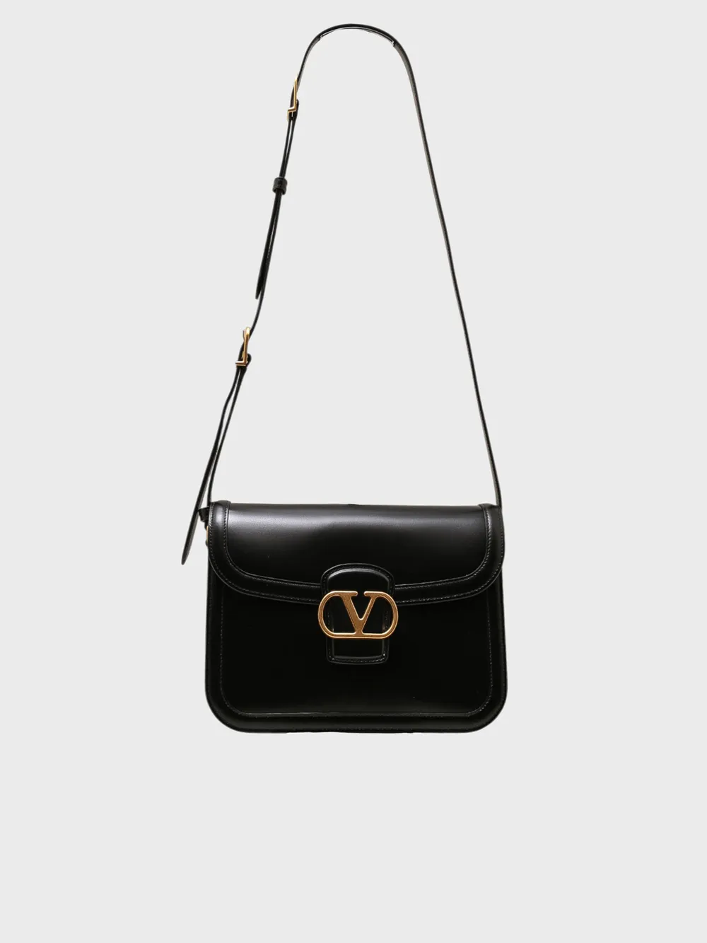 Сумка Valentino выполнена из черной гладкой кожи с лаконичным дизайном и золотым логотипом бренда. Модель дополнена длинным регулируемым ремнем, который позволяет носить сумку как через плечо, так и на руке. Застежка-ремешок с металлическими деталями обеспечивает надежную фиксацию. Внутреннее отделение просторное и функциональное, идеально подходящее для повседневного использования. Стильная и элегантная — универсальный аксессуар для любого образа.