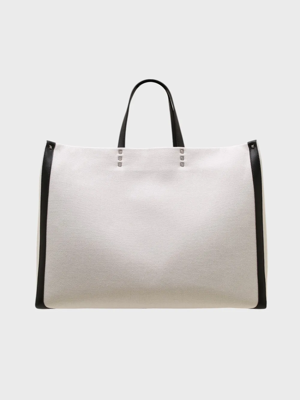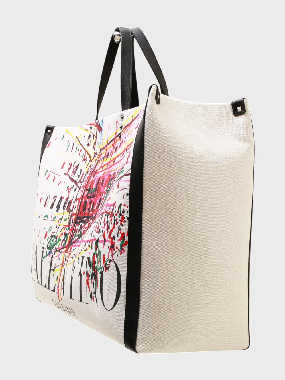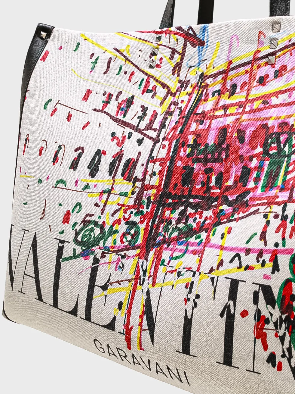 Сумка Valentino выполнена из светло-бежевого хлопкового канваса с текстурой, дополненной черными кожаными вставками по краям. Модель украшена ярким абстрактным принтом с красочными линиями и надписью "VALENTINO GARAVANI", добавляющей современный и артистичный акцент. Простой, но стильный дизайн делает эту сумку универсальным аксессуаром для повседневной носки или особенных случаев.