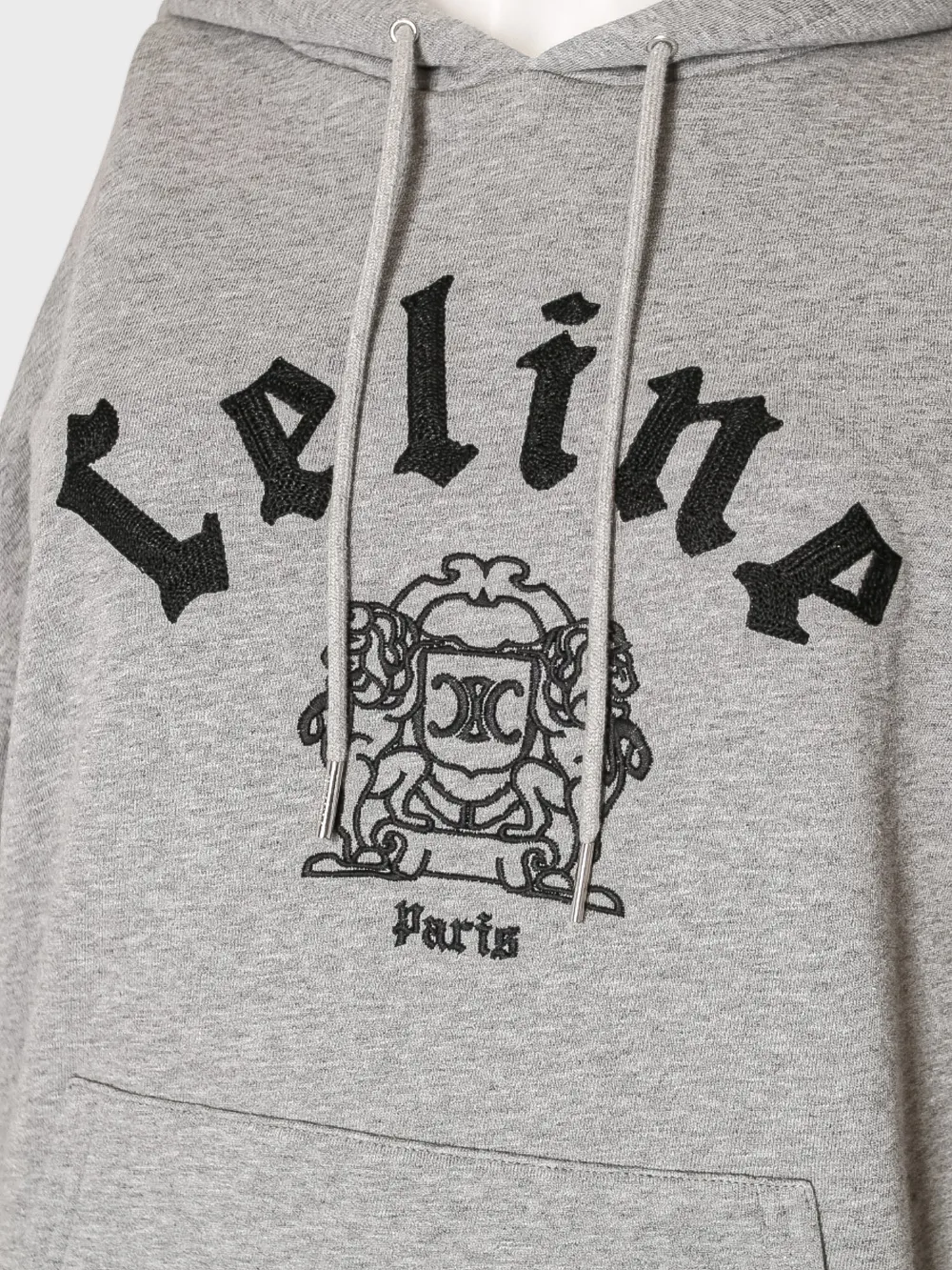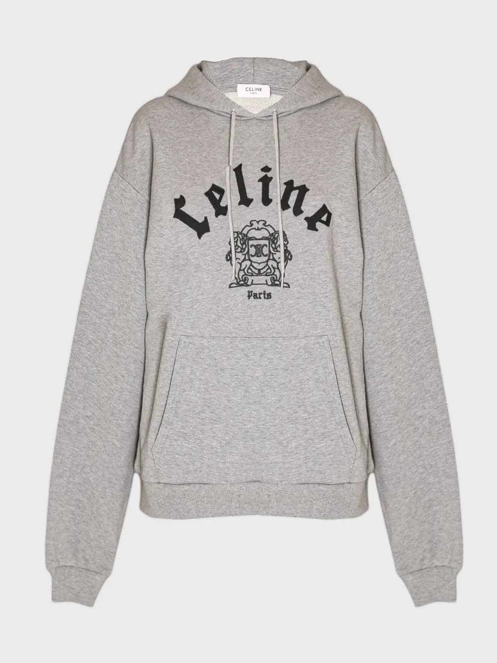 Худи Celine выполнено из мягкого серо-бежевого трикотажа с комфортным и стильным дизайном. Модель дополнена капюшоном, двумя карманами спереди и крупным логотипом бренда на груди в черном цвете. Особенностью модели является вышивка герба с символикой бренда, добавляющая уникальности и элегантности. Простой силуэт и высокое качество материалов делают худи идеальным выбором для повседневного стиля или отдыха.