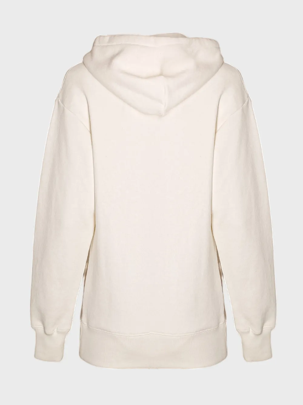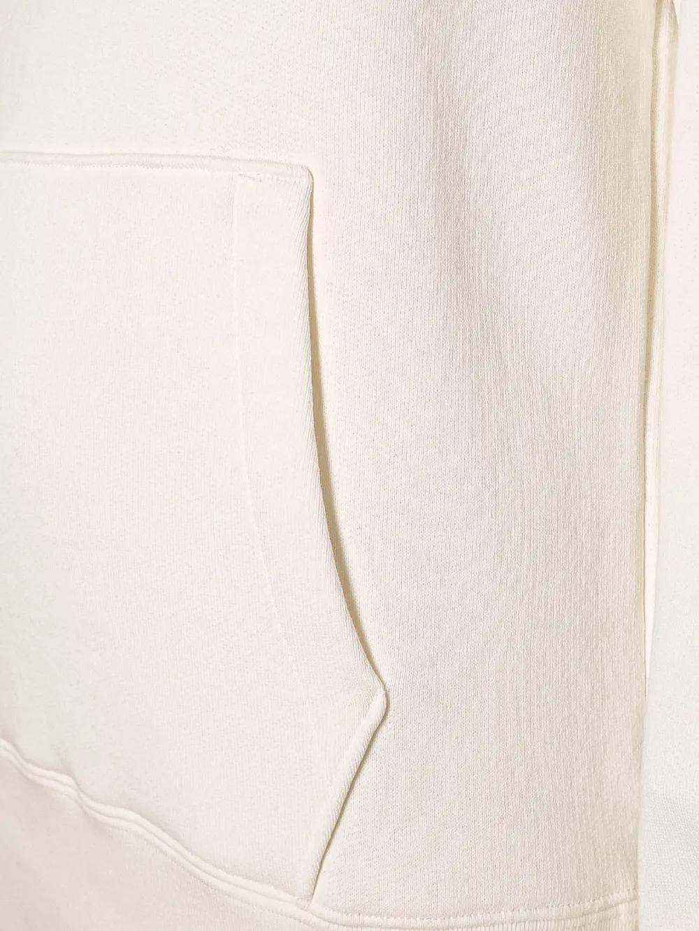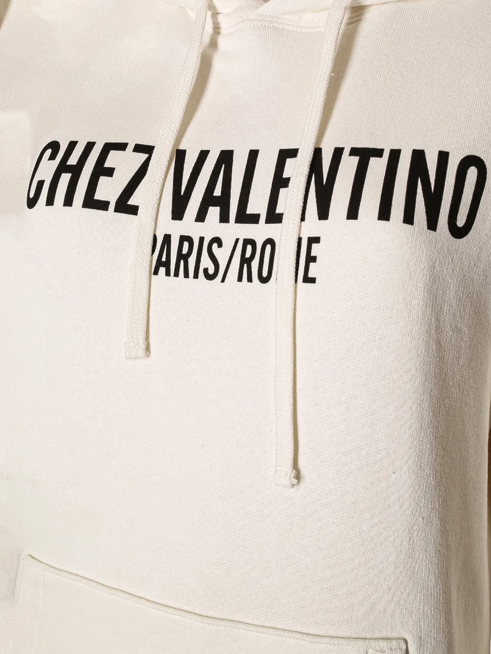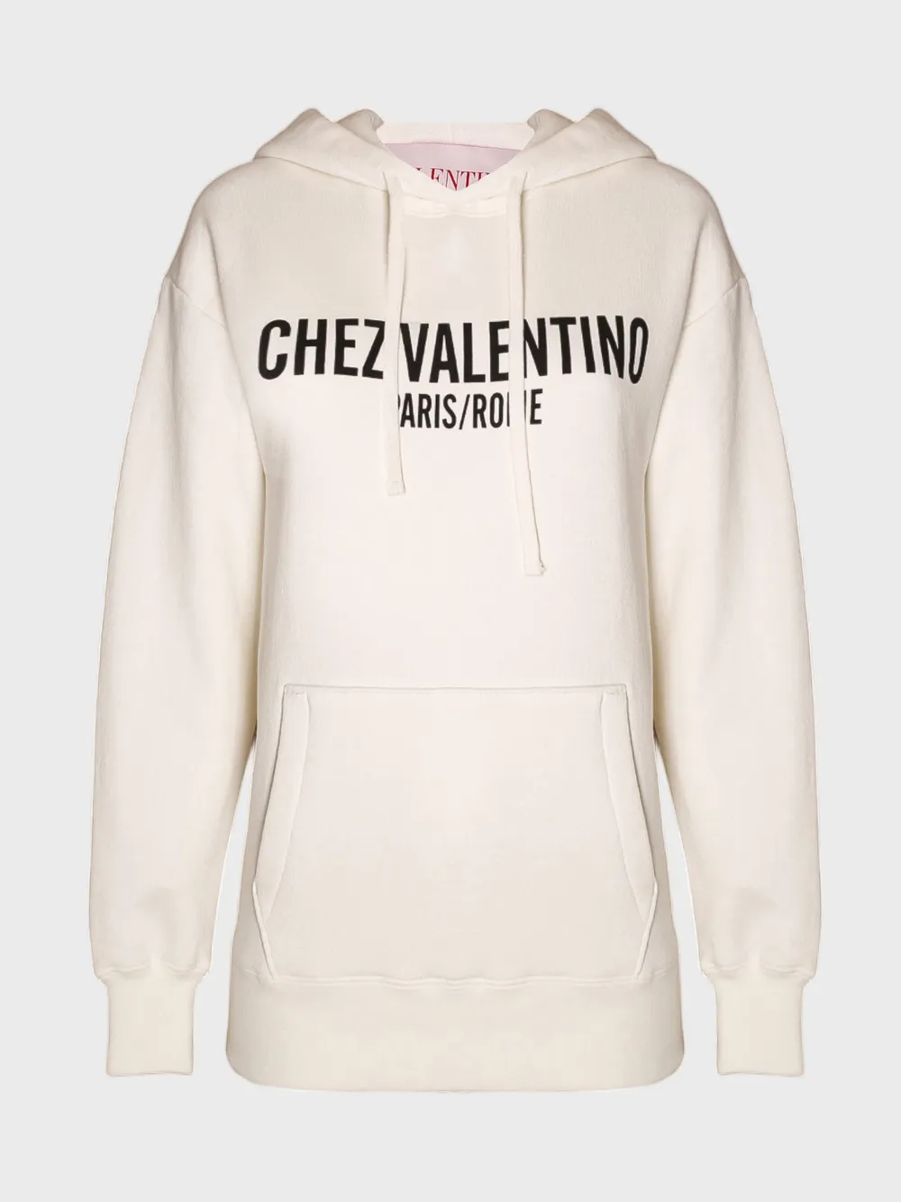 Худи Valentino выполнено из мягкого и комфортного хлопкового трикотажа в нежно-бежевом цвете. Модель дополнена капюшоном с регулируемыми шнурками, которые позволяют настроить посадку под индивидуальные пропорции. На груди расположена крупная черная надпись "CHEZ VALENTINO PARIS/ROME", которая является фирменным элементом дизайна бренда. Худи оснащено двумя большими карманами спереди для удобства хранения мелочей. Стильное и практичное изделие идеально подходит как для повседневной носки, так и для создания современных образов.