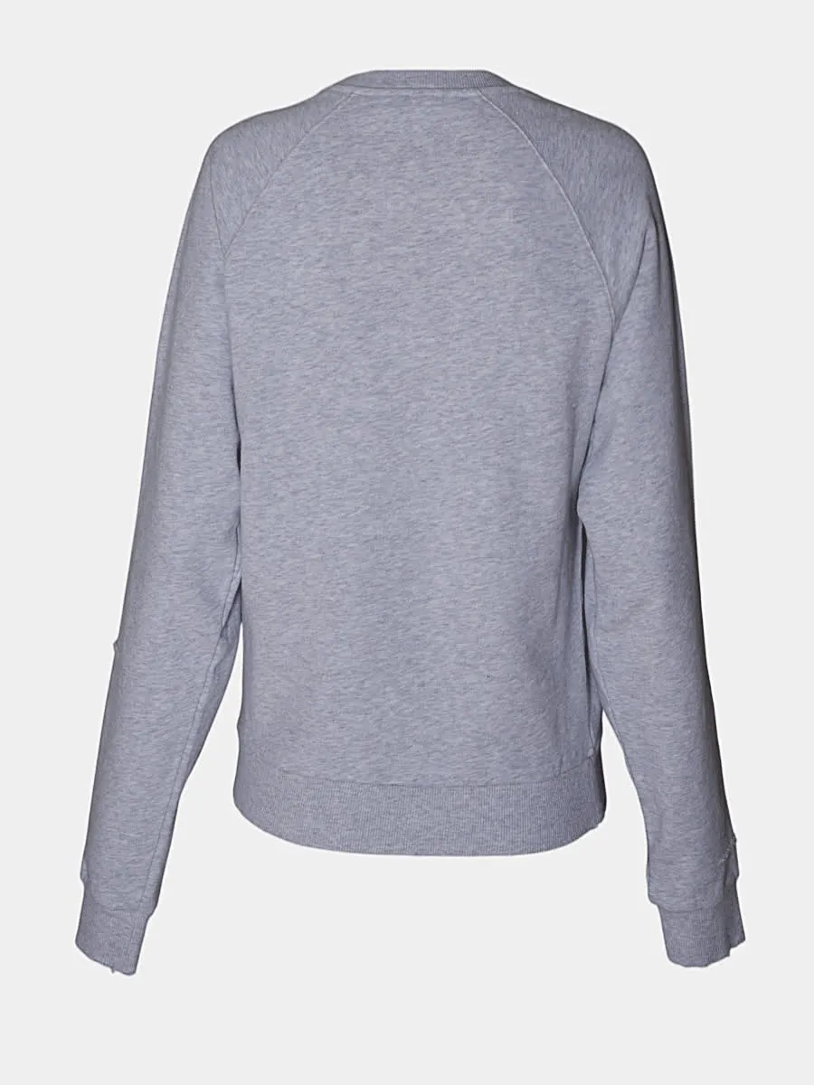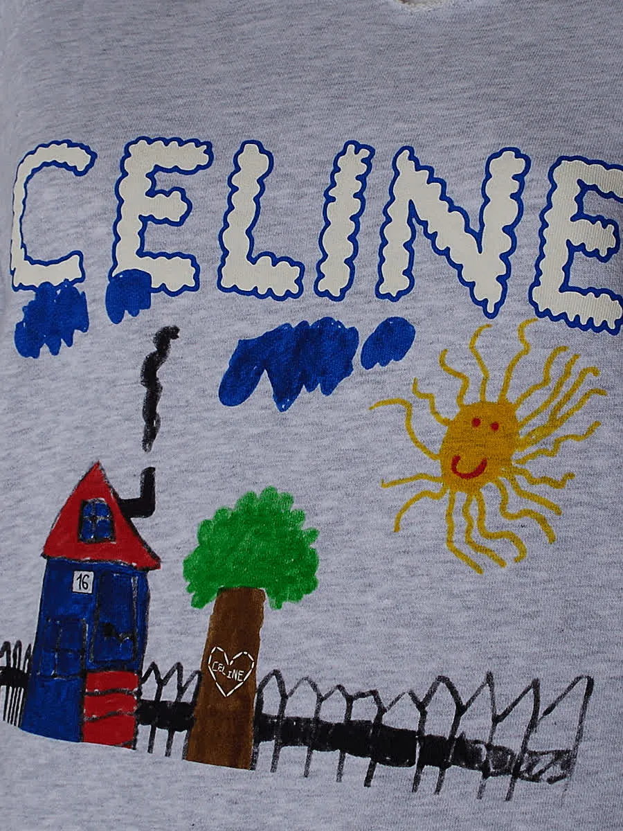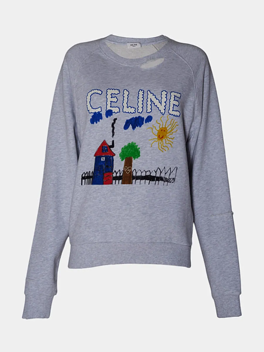 Свитшот Celine выполнен из мягкой хлопковой ткани серого цвета с ярким вышитым принтом в стиле детского рисунка: надпись «CELINE», домик, солнце и дерево — сочетание уютного кроя и арт-дизайна, подчёркивающее индивидуальность и современный стиль бренда.