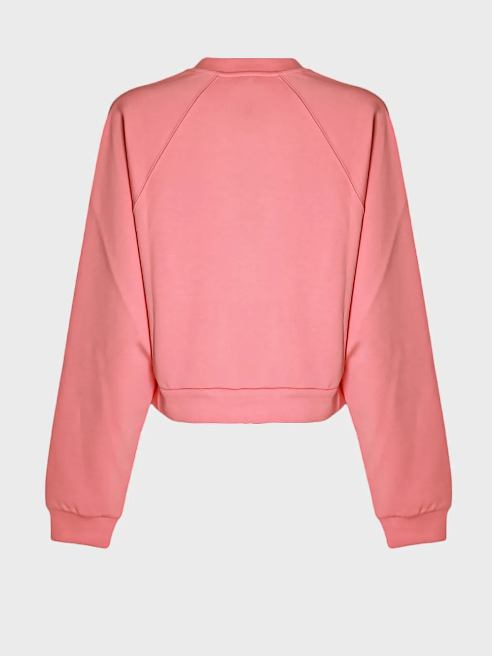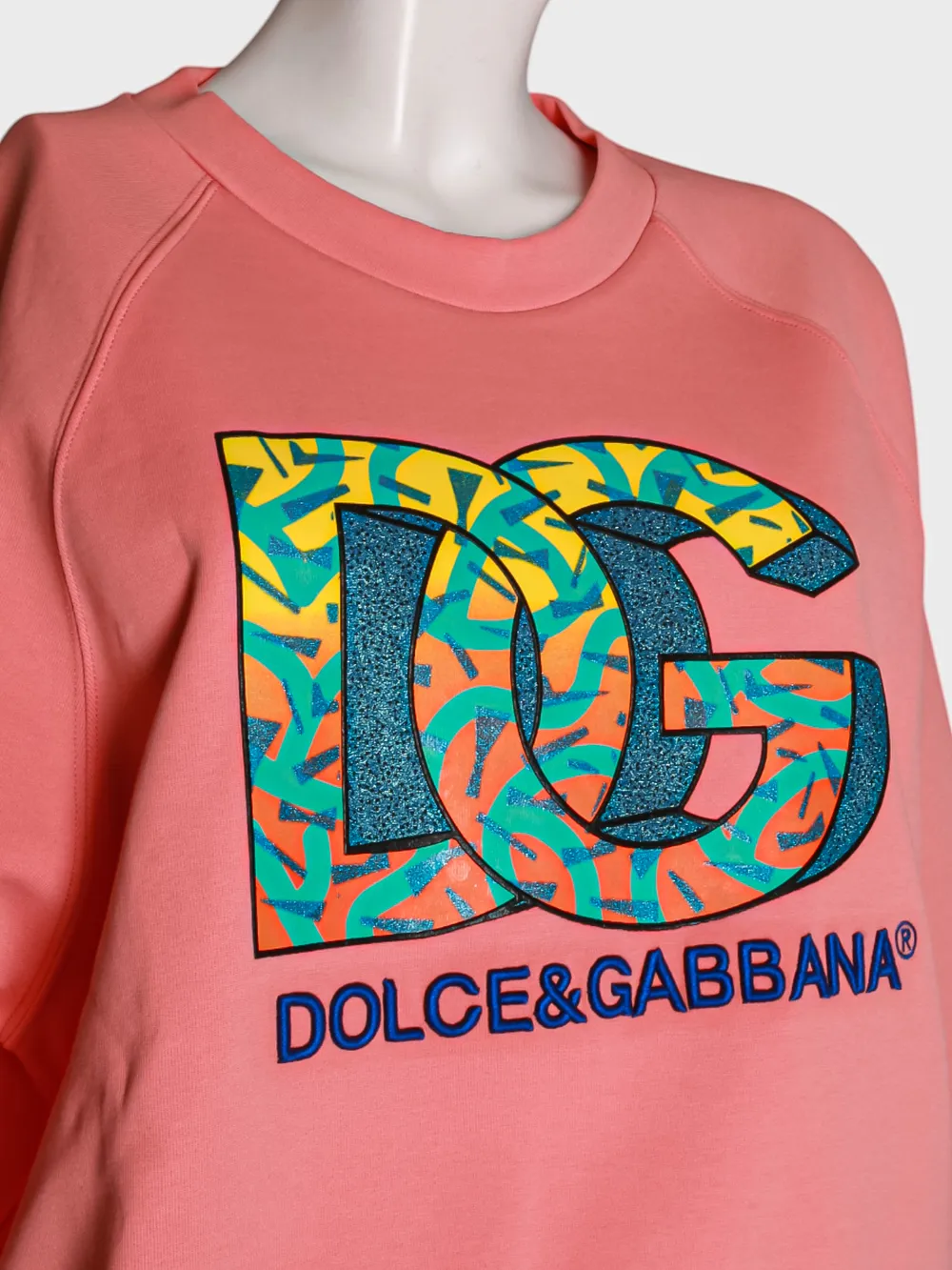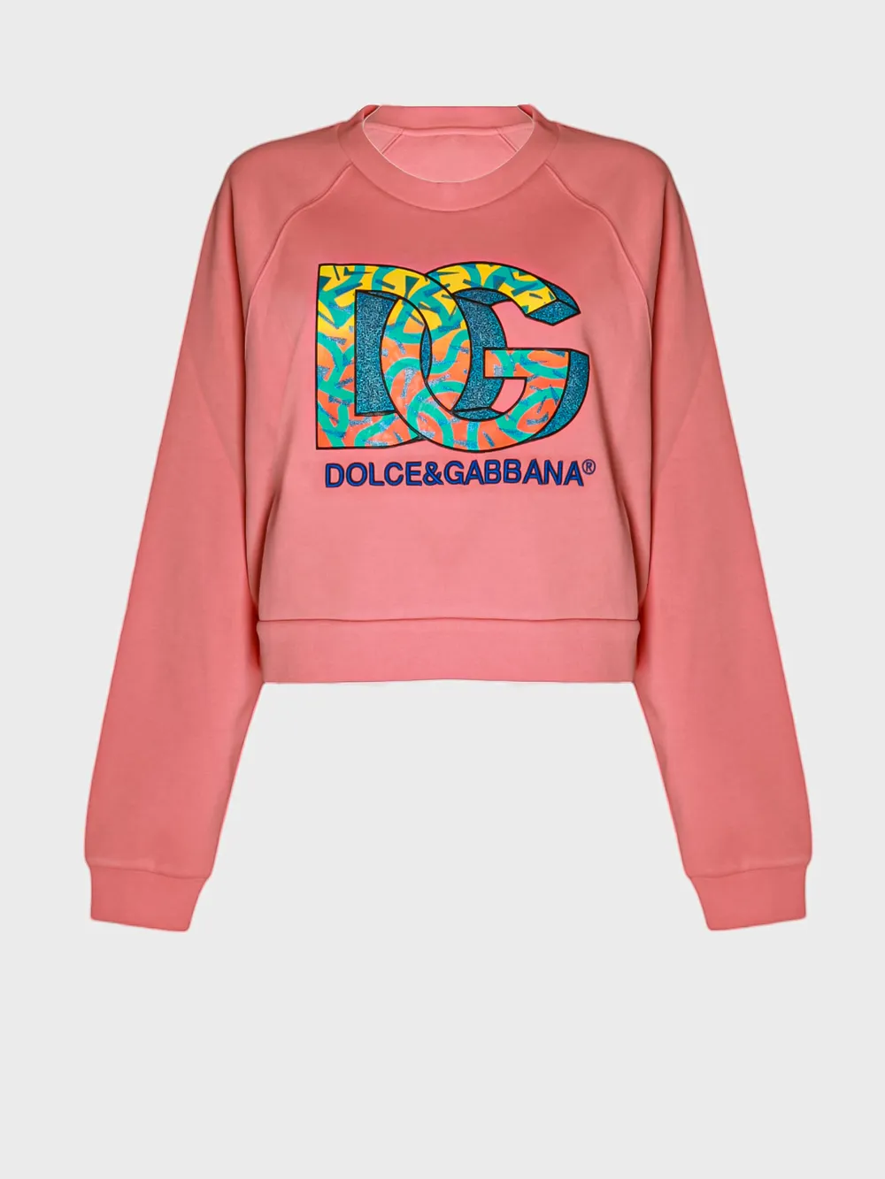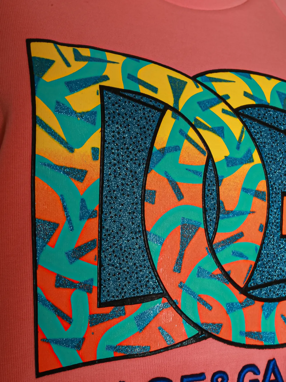Свитшот Dolce&Gabbana выполнен из мягкого розового хлопка с комфортным кройю и круглым вырезом. Модель дополнена крупным ярким принтом логотипа бренда, выполненным в стиле абстрактного пэчворка с контрастными цветами и блестящими деталями. Простой силуэт и стильный декор делают свитшот идеальным аксессуаром для повседневного образа.