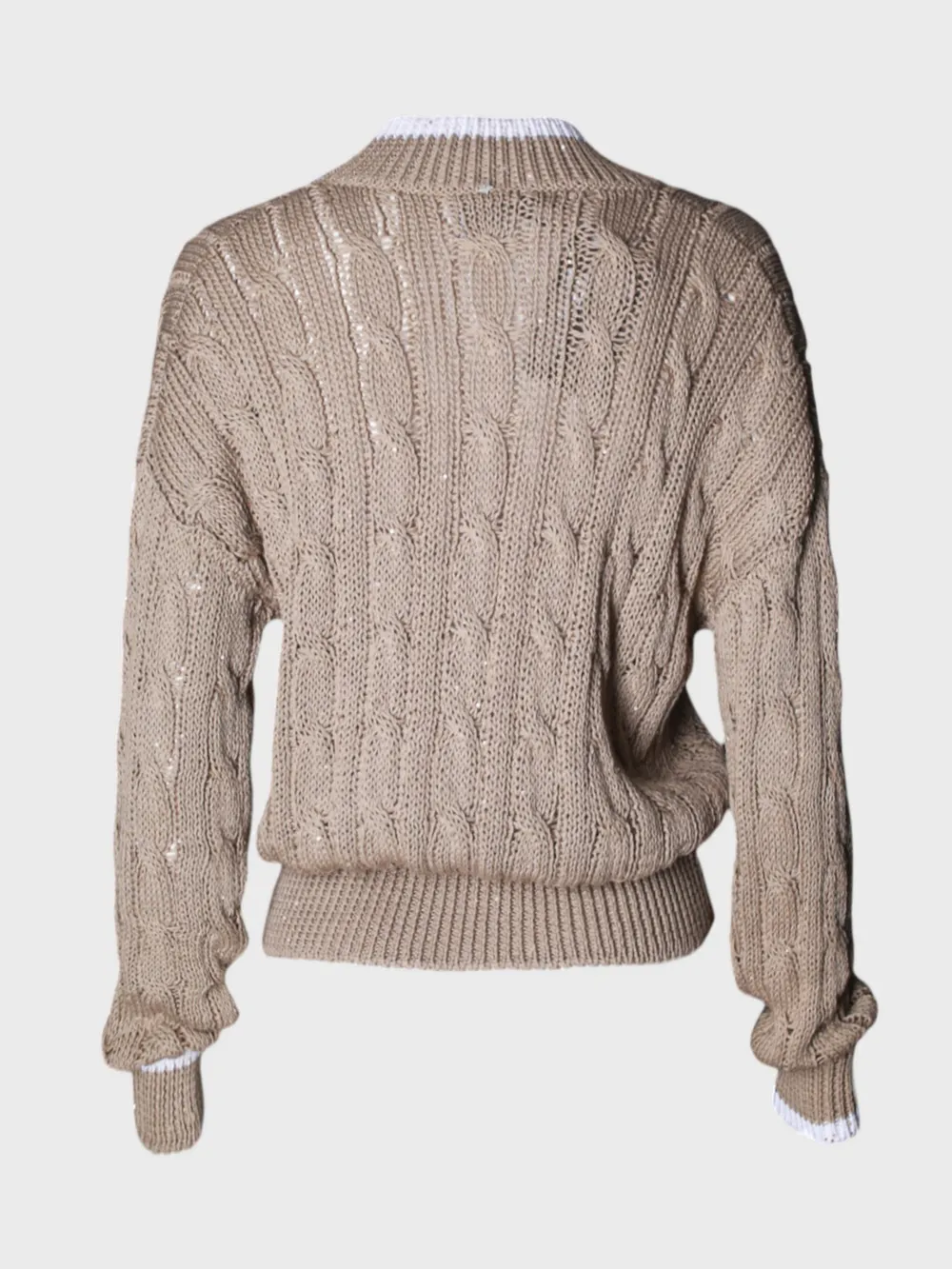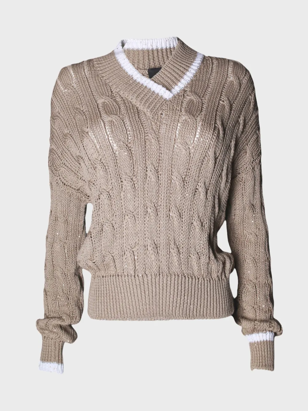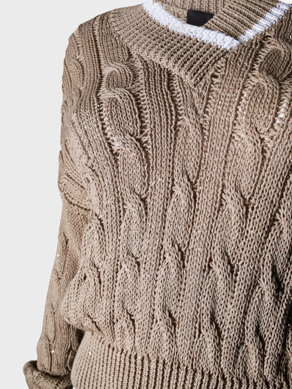 Джемпер прямого кроя Lorena Antoniazzi выполнен из качественного вязаного материала с фактурным узором, создающим теплоту и комфорт. Модель дополнена V-образным вырезом и контрастными белыми деталями на горловине и манжетах, добавляющими современный акцент. Свободный силуэт и длинные рукава обеспечивают удобство носки, а декоративные пайетки придают изделию легкое мерцание. Идеально сочетается как с базовыми, так и с более яркими образами, создавая уютный и стильный лук.