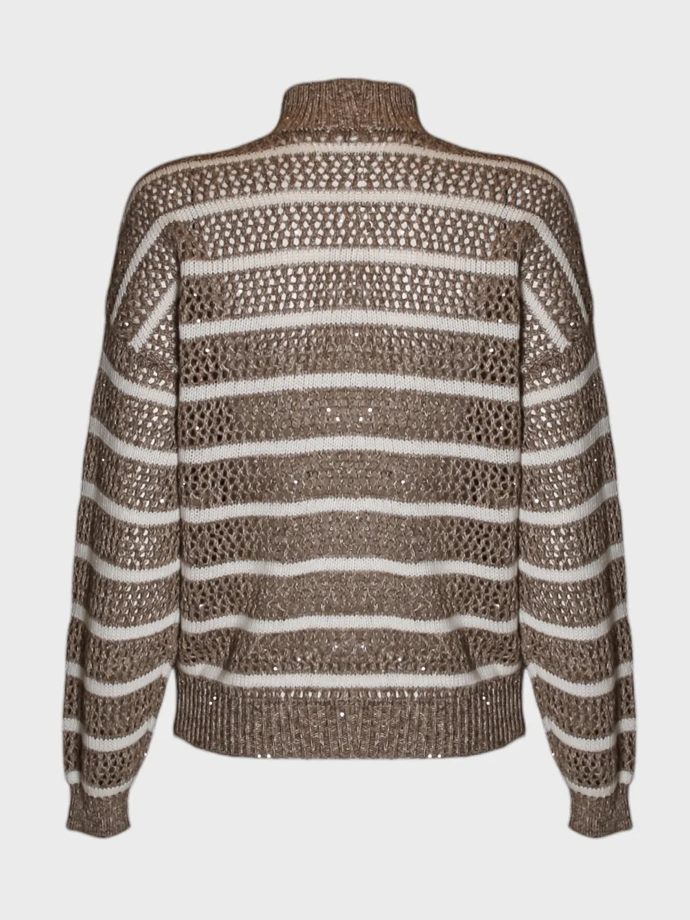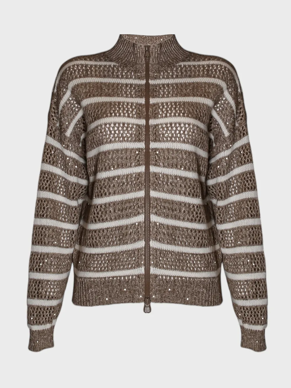 Кардиган Brunello Cucinelli выполнен из тонкого вязаного трикотажа с эффектом мелких блесток, сочетает коричневый и белый цвета в горизонтальной полоску, а также проработанную сетчатую текстуру; модель на молнии с высоким воротником — элегантный и утончённый элемент гардероба, сочетающий комфорт и роскошь.