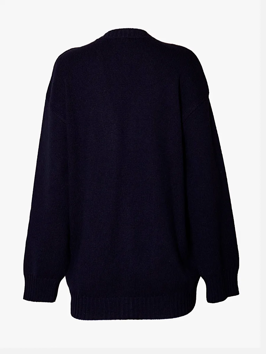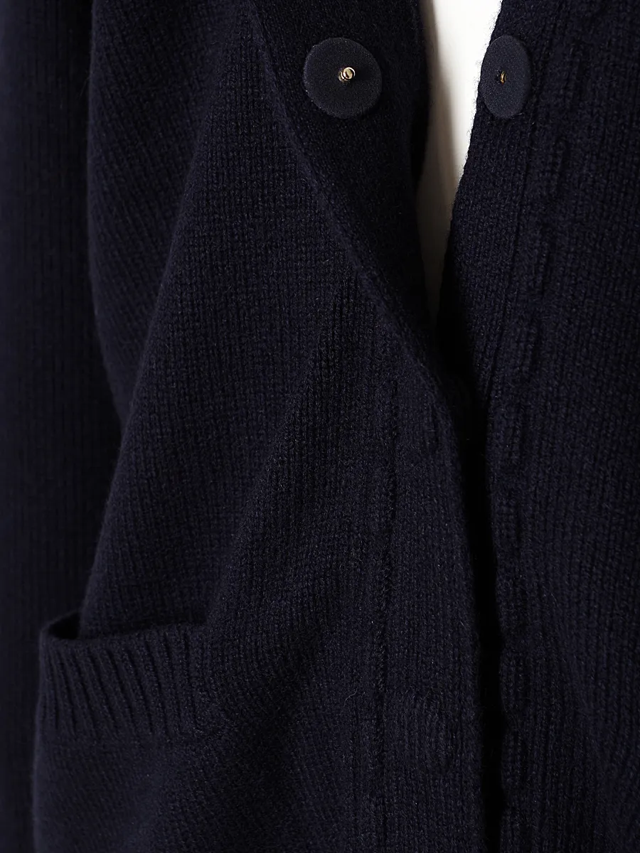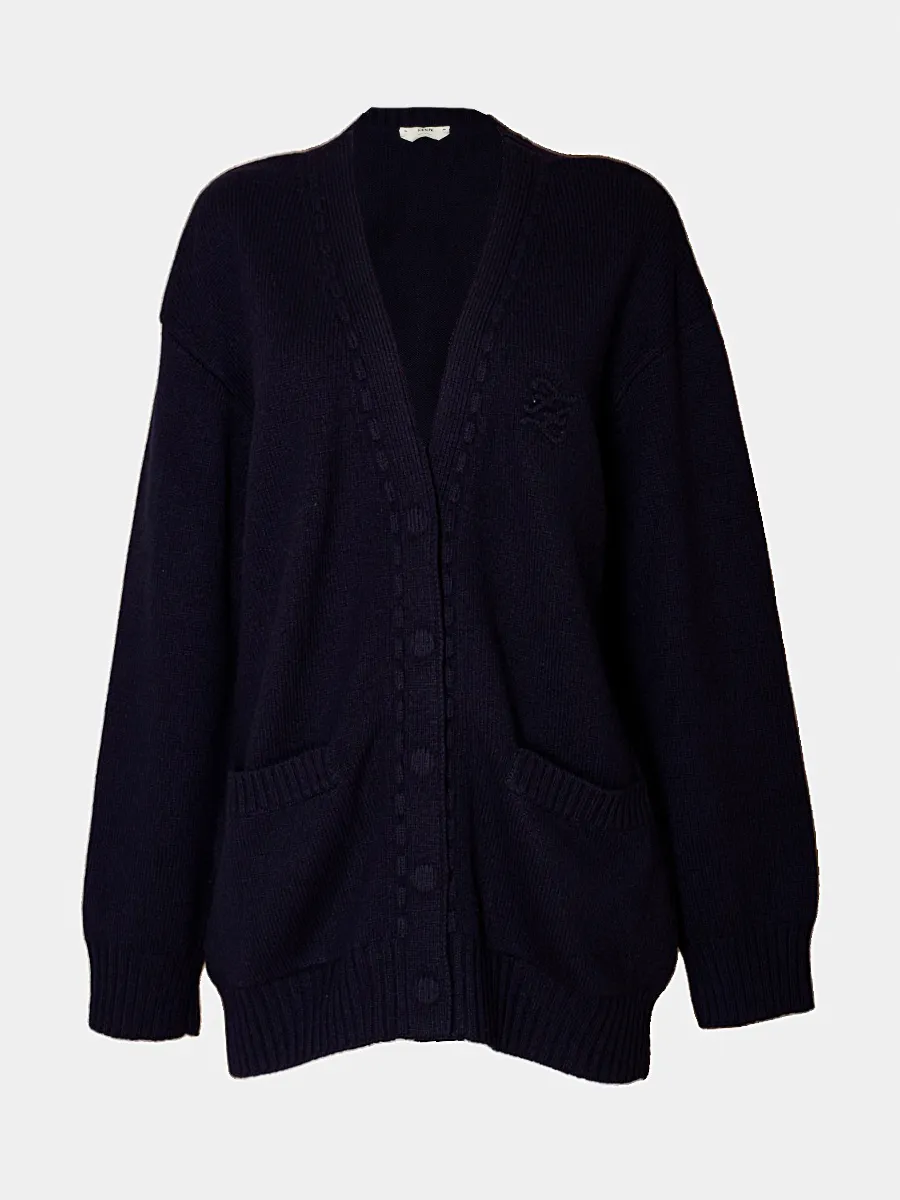 Кардиган Fendi выполнен из качественного темно-синего трикотажа с длинными рукавами. Модель дополнена декоративными элементами в виде пуговиц и карманов, а также эластичной посадкой для комфортной носки. Простой дизайн и акцент на деталях делают кардиган идеальным выбором для повседневной носки или как базовый элемент в гардеробе.