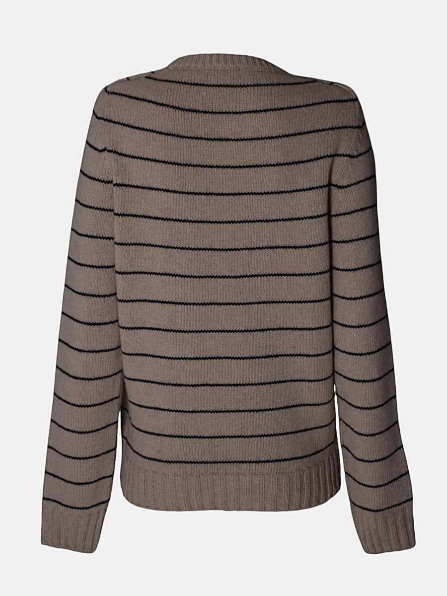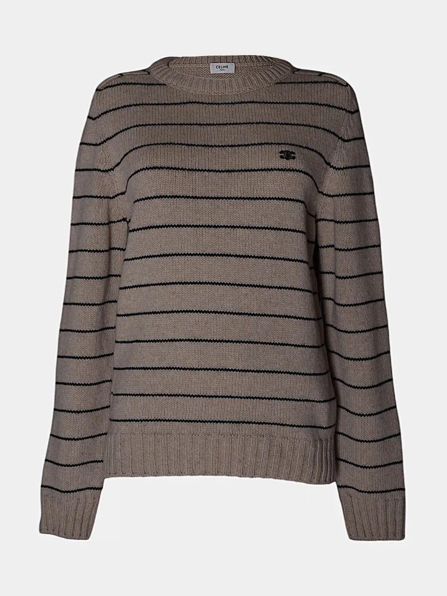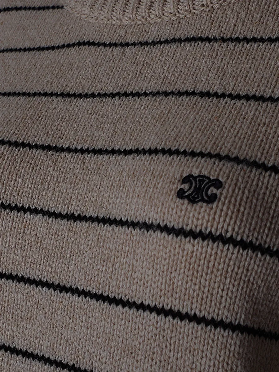Кофта Celine выполнена из высококачественной тонкой пряжи в нейтральном оттенке с чёрными горизонтальными полосами; модель с круглым вырезом и длинными рукавами дополнена фирменным логотипом на груди — сочетание классического кроя и узнаваемого стиля бренда, идеально подходящее для повседневного и утончённого образа.