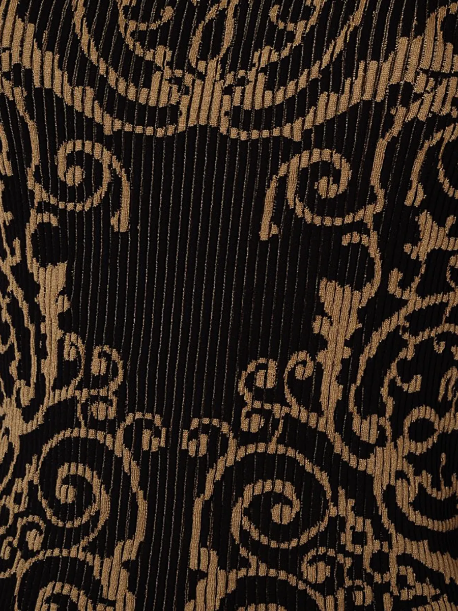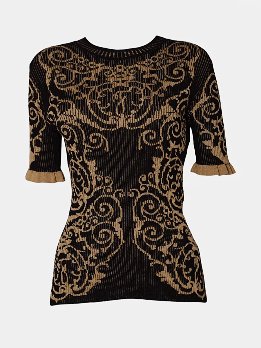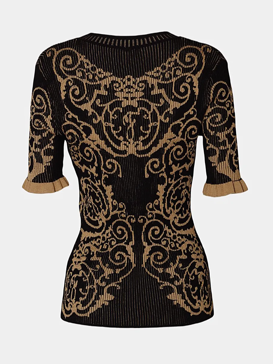 Кофта Fendi выполнена из высококачественного шерстяного трикотажа черного цвета с эффектным золотистым узором в стиле барокко. Модель дополнена короткими рукавами и округлым вырезом, создавая элегантный и роскошный силуэт. Тонкая фактура материала подчеркивает безупречное качество исполнения, а богатый декор делает кофту идеальным аксессуаром для вечернего или особого случая.