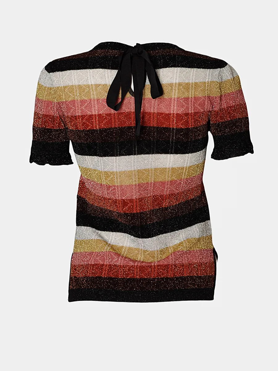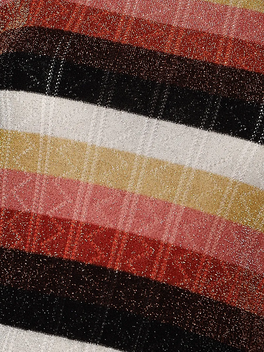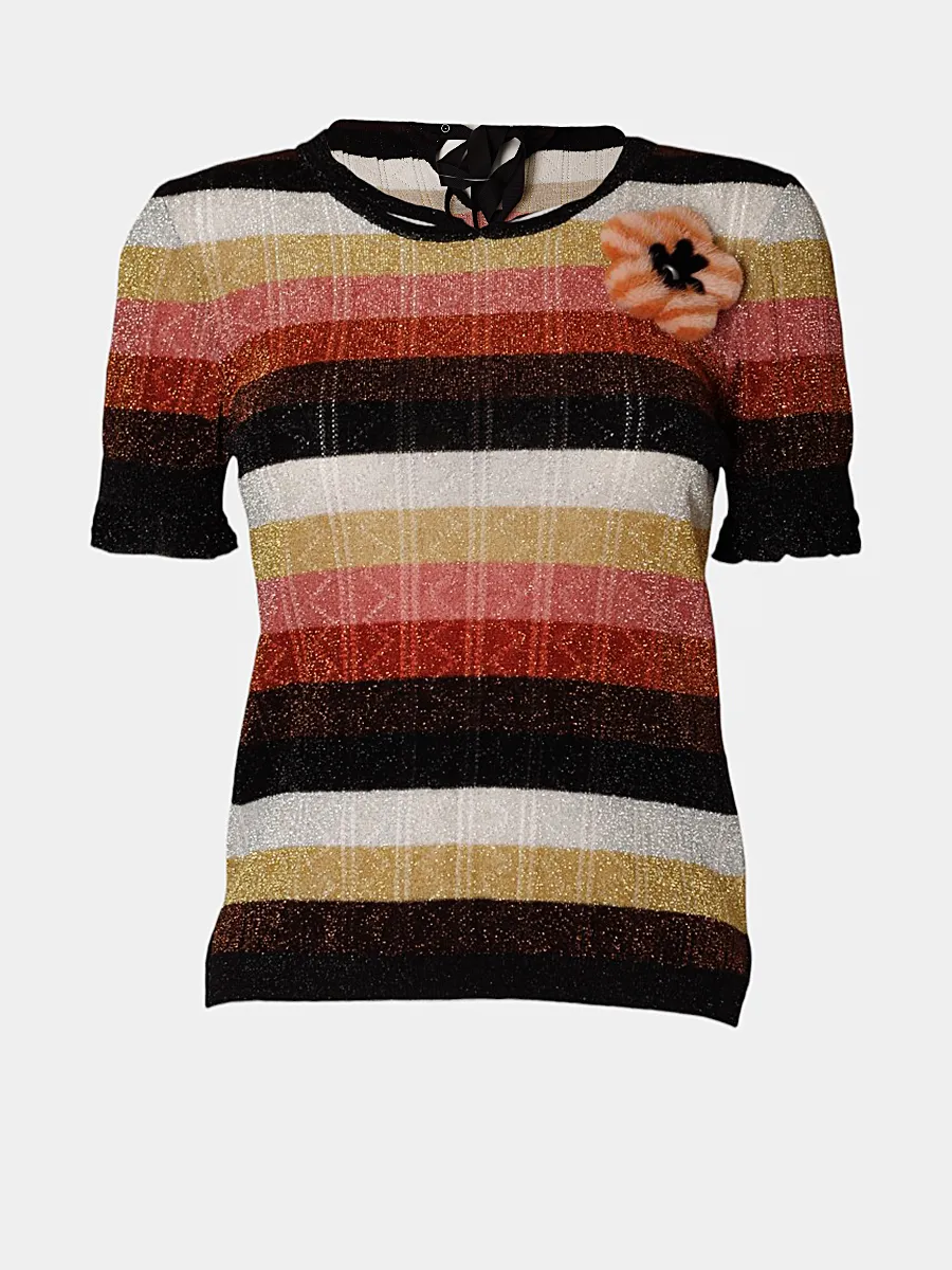 Кофта Fendi выполнена из блестящей пряжи с эффектом люрекса, украшена контрастными горизонтальными полосами в теплой цветовой гамме. Модель дополнена декоративной объемной аппликацией в виде цветка и завязкой на спинке, придающей акцентный стиль. Краткий крой и рукав-реглан делают эту кофту универсальным элементом для создания модных образов.