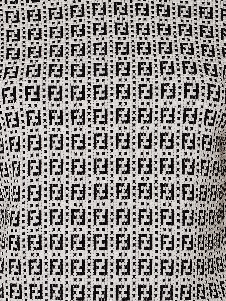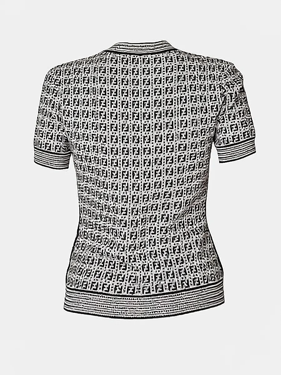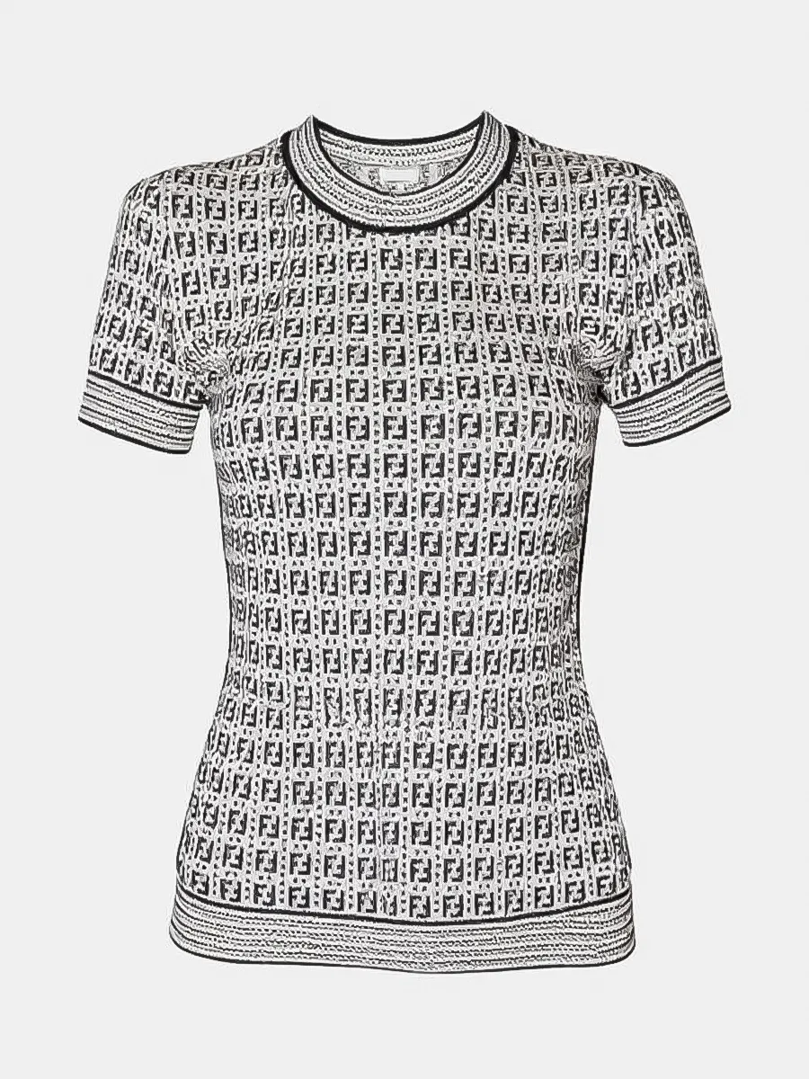 Кофта Fendi выполнена из тонкого материала с геометрическим узором, состоящим из повторяющихся черных и белых элементов в виде логотипа бренда. Модель имеет круглый вырез и короткие рукава. Дизайн кофты отличается минимализмом и современностью, при этом она сохраняет узнаваемость благодаря фирменному принту. Края кофты декорированы текстурной отделкой, добавляющей фактурность и завершенность образу. Кофта подходит для повседневной носки или как базовый элемент в составе более сложного образа.