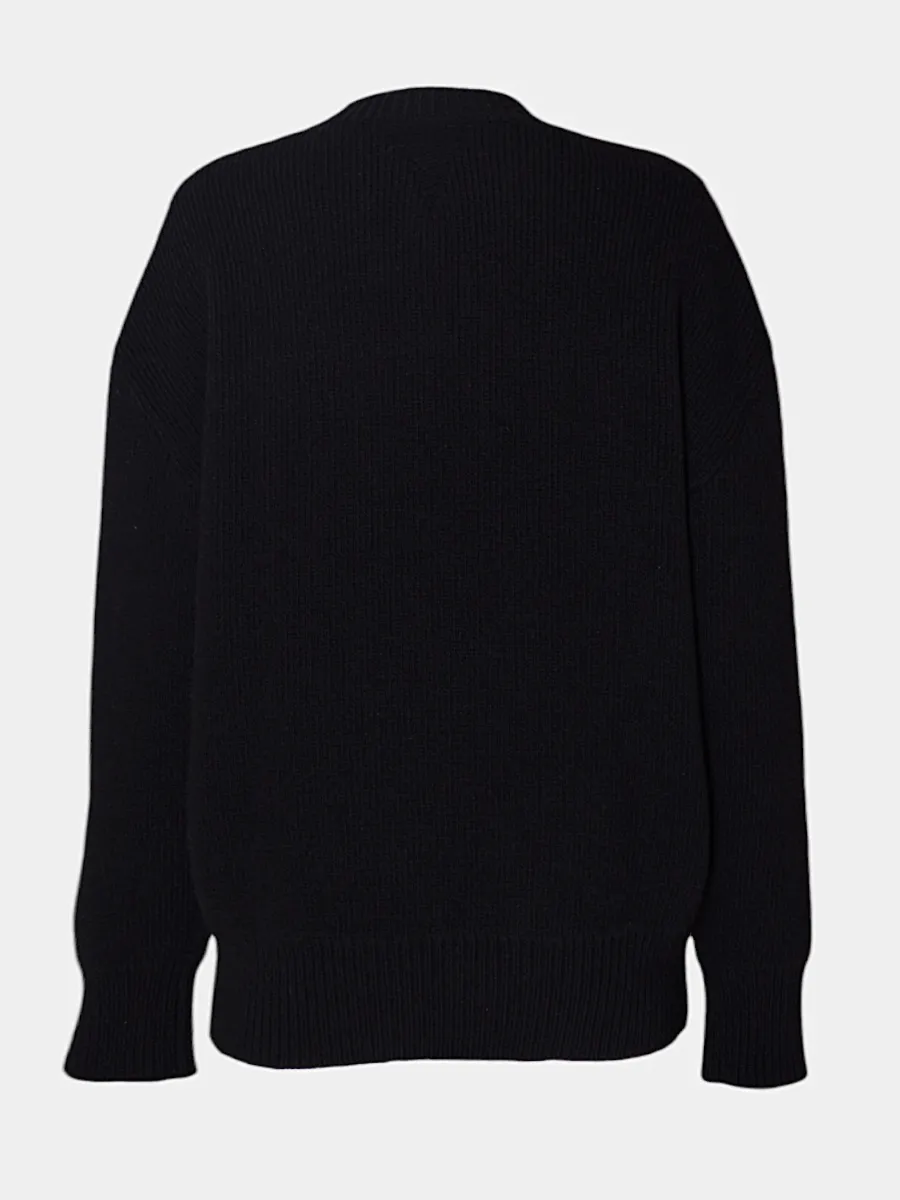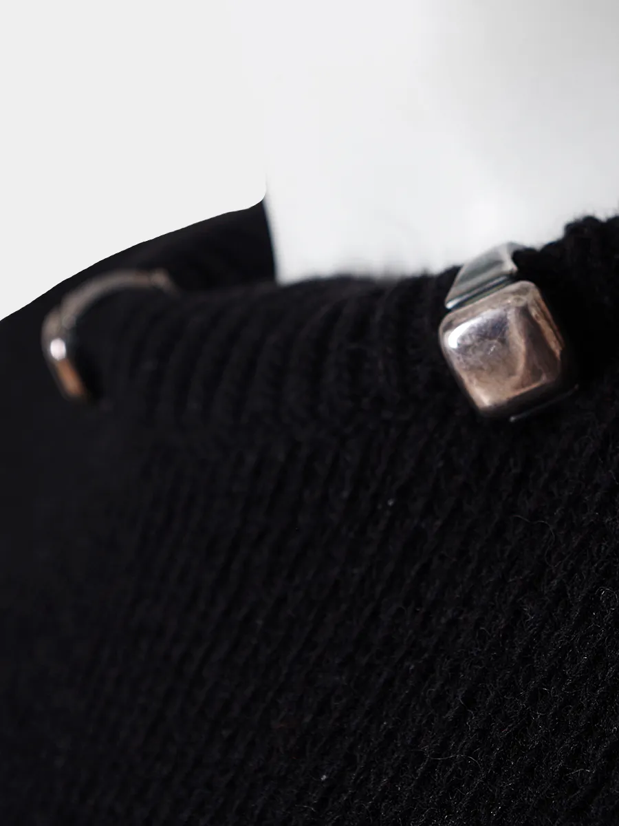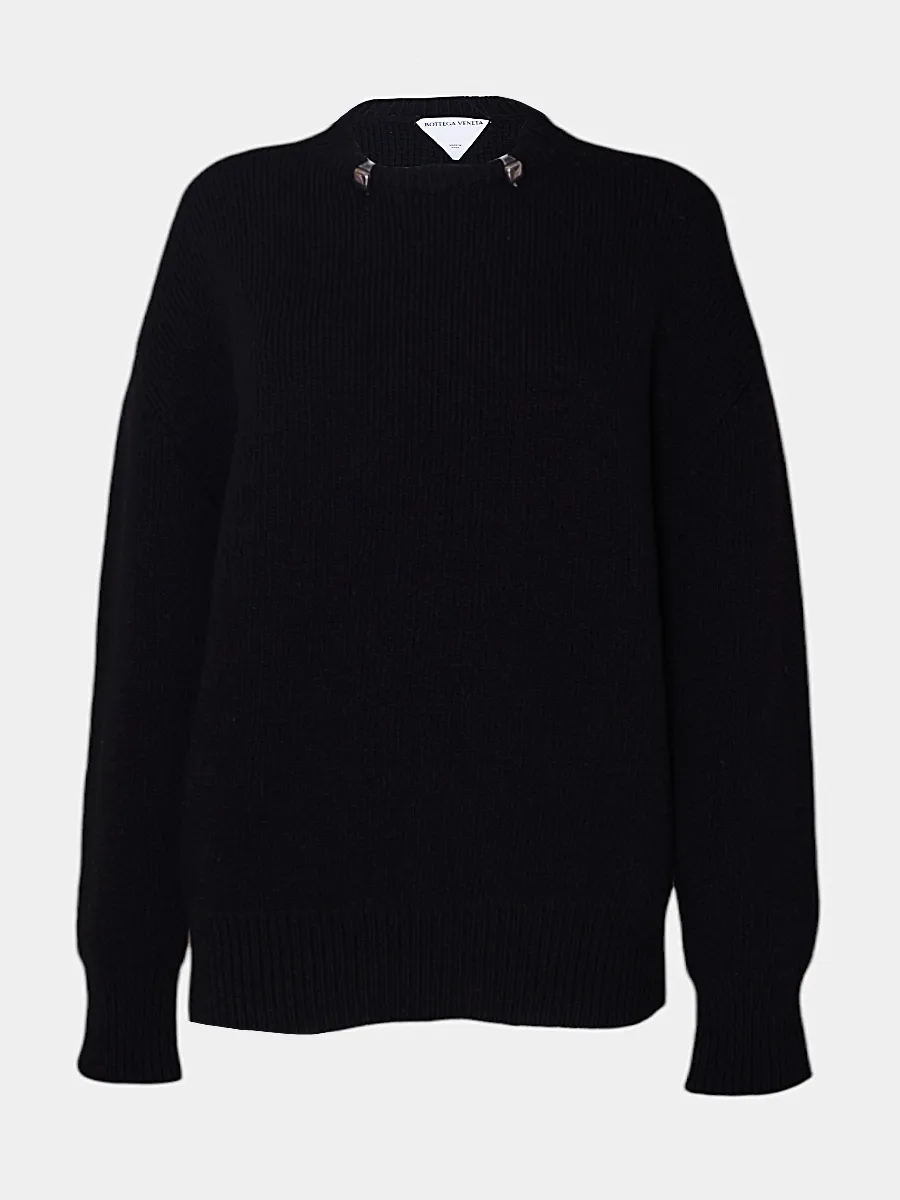 Свитер Bottega Veneta выполнен из плотного трикотажа чёрного цвета с рельефной фактурой, сочетает минималистичный крой и изысканные детали: округлый вырез с декоративными металлическими кольцами на плечах — элегантный и современный элемент повседневного образа.