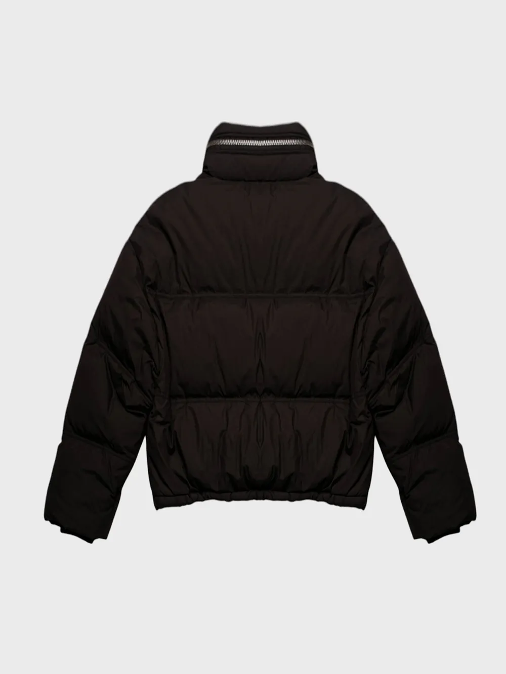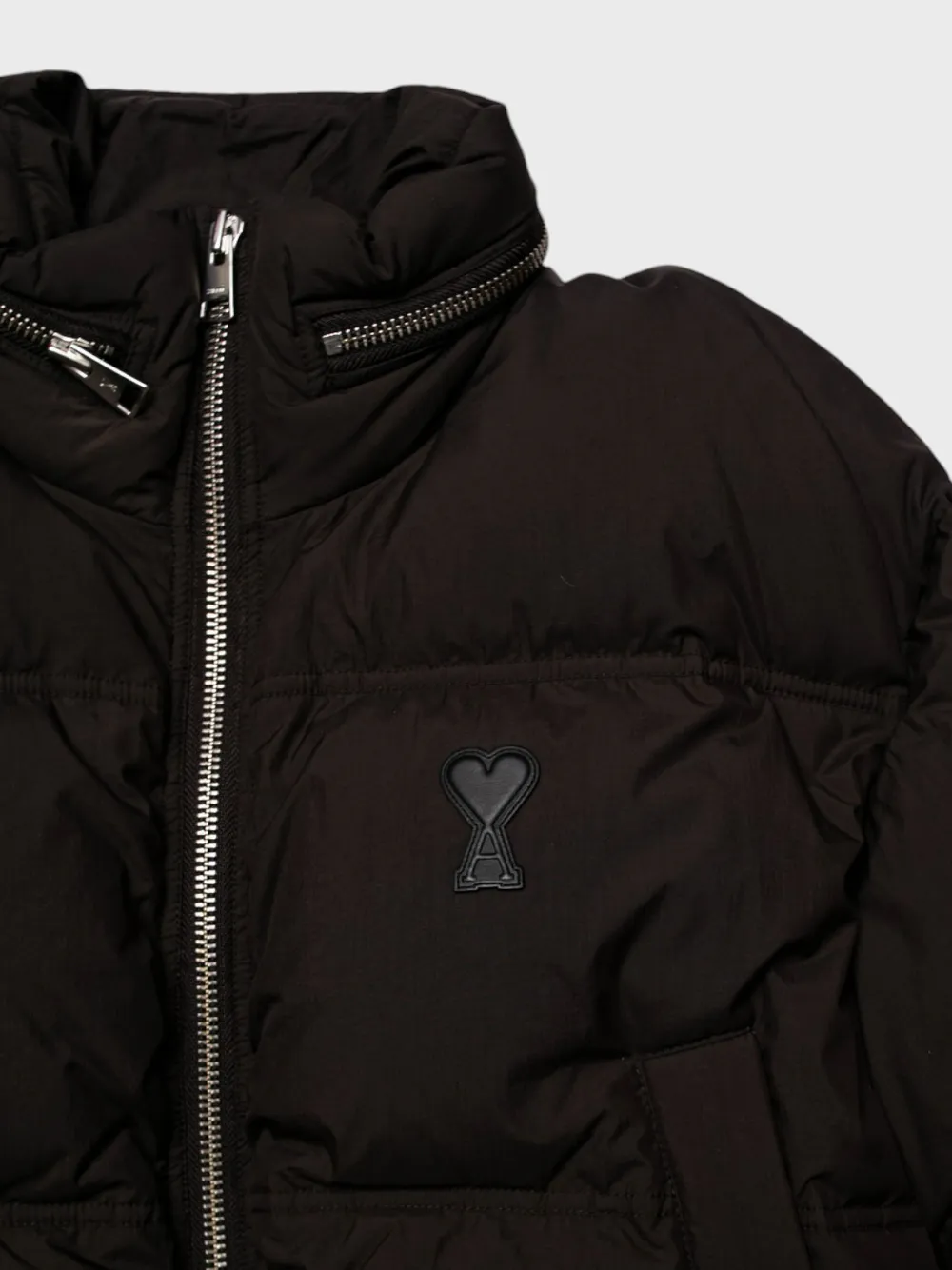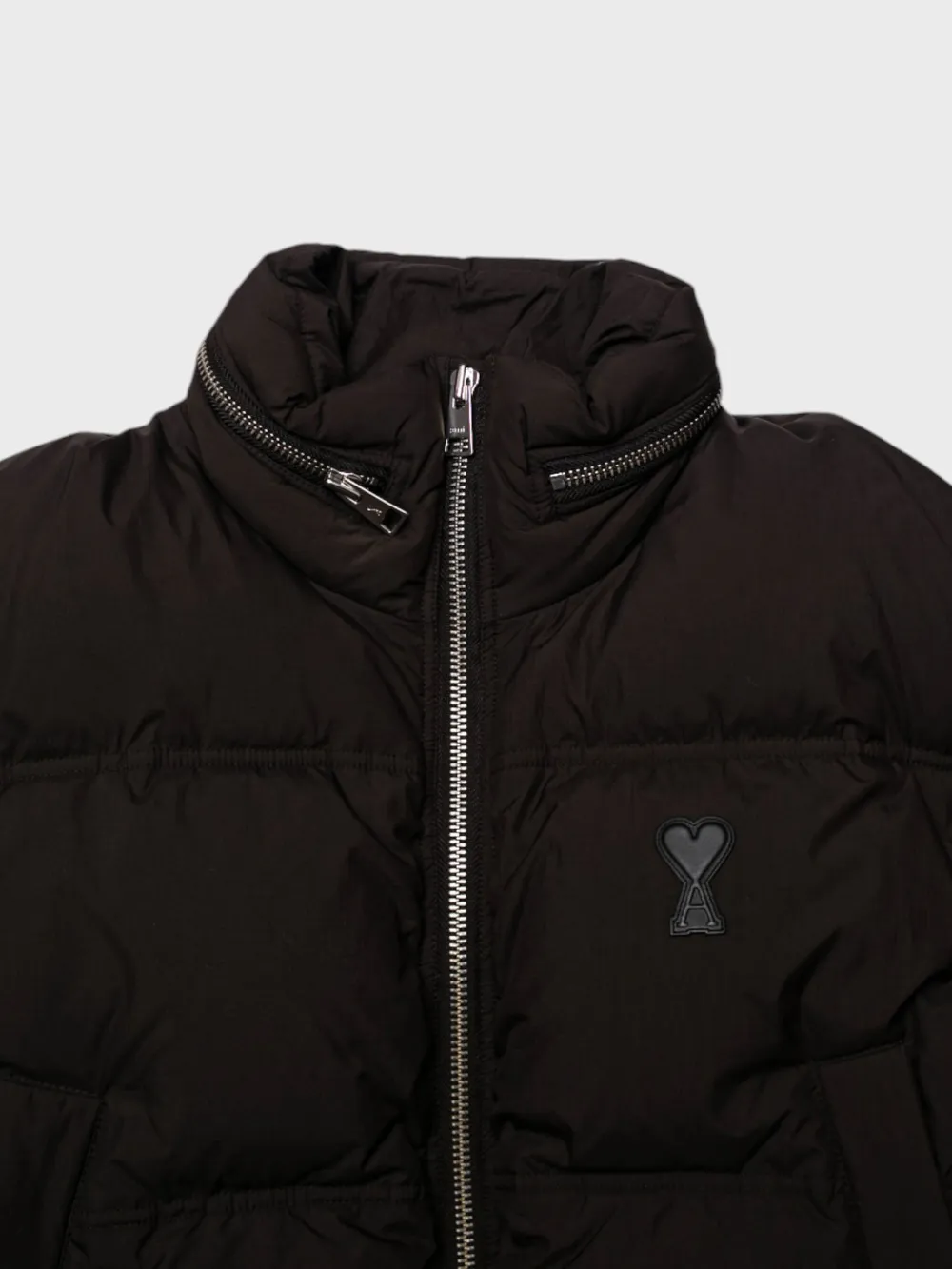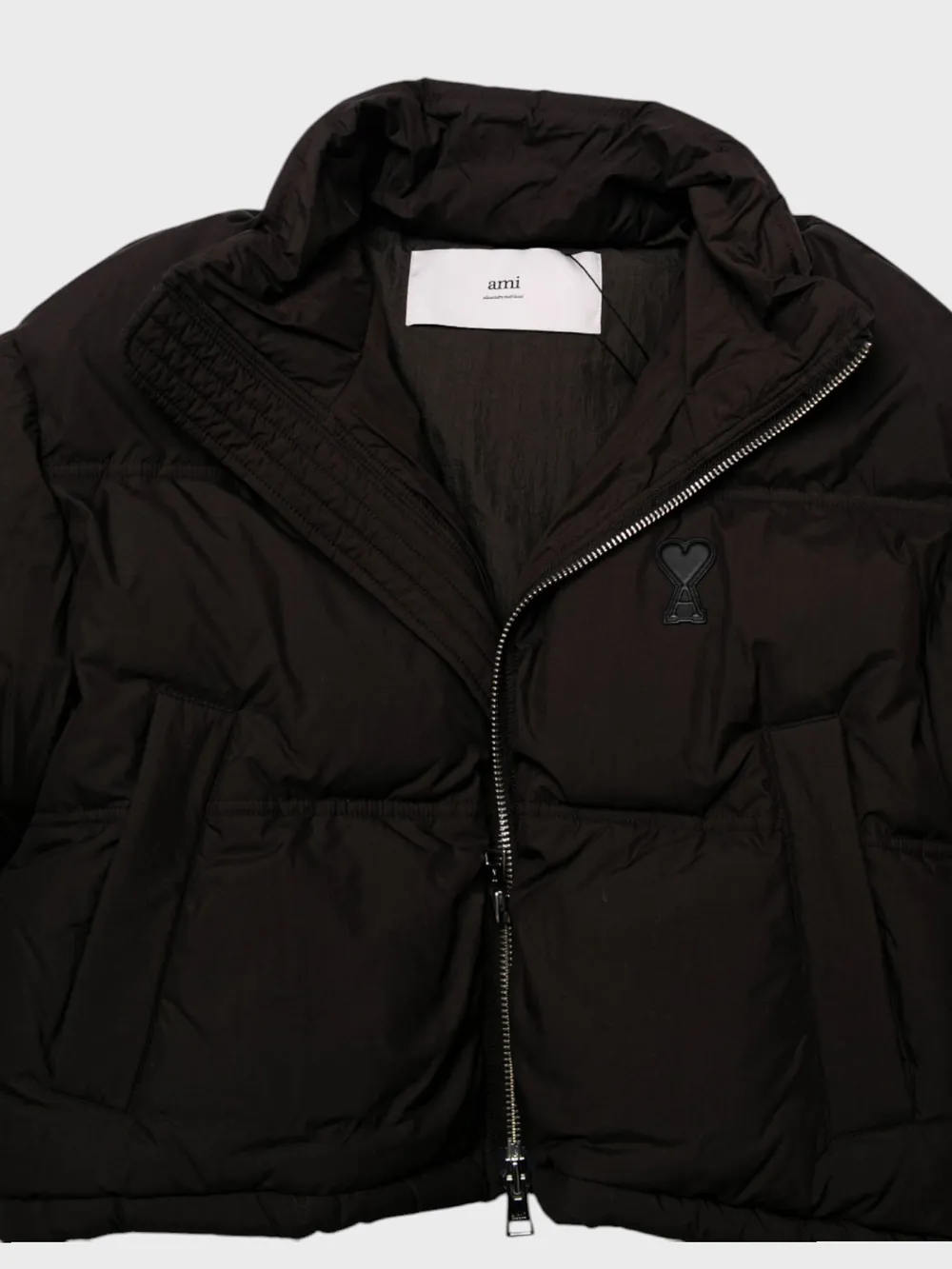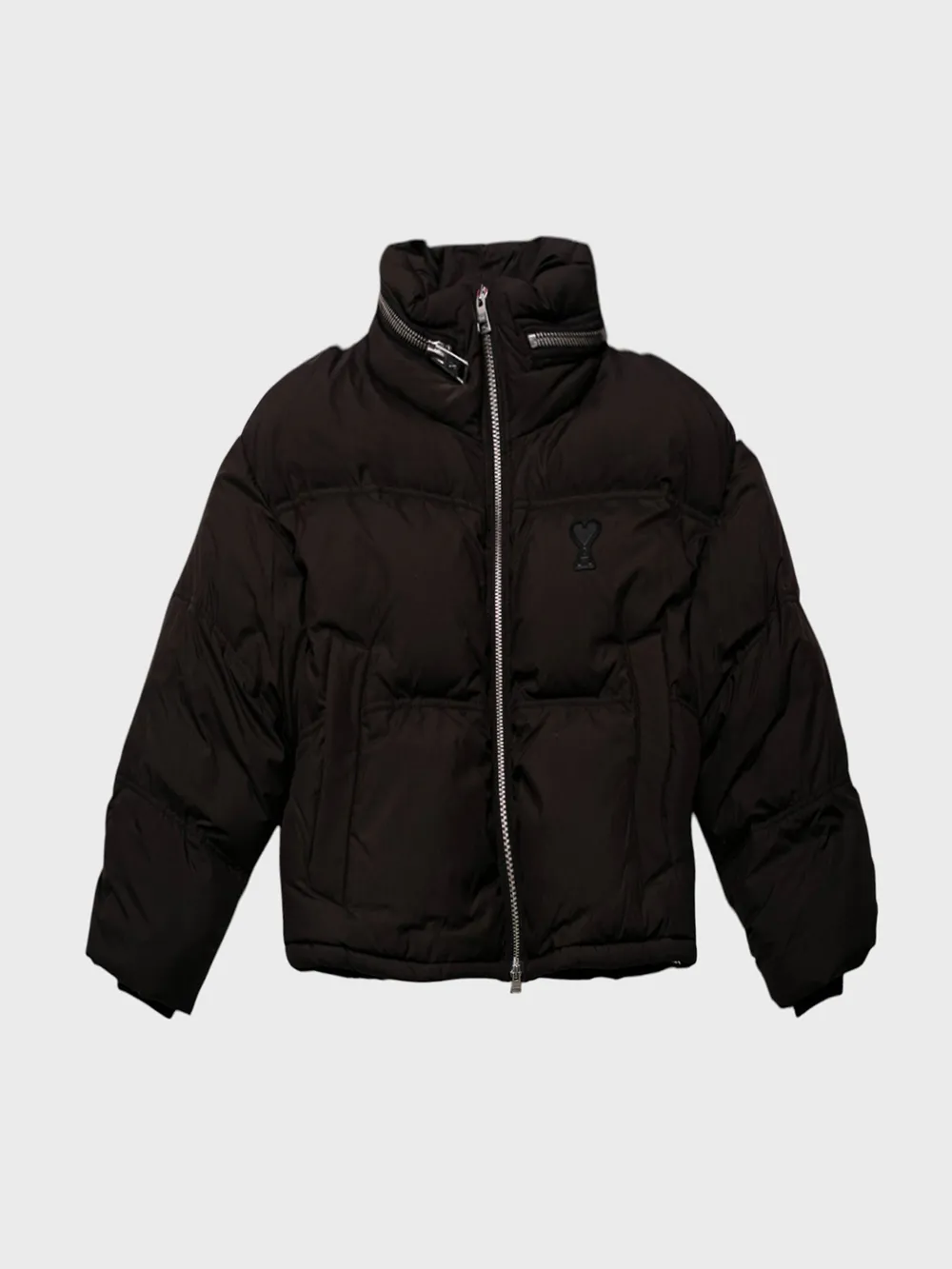 Куртка Ami выполнена из плотного, утепленного материала в черном цвете. Модель имеет прямой крой с объемными рукавами и высоким воротником для защиты от холода. Застежка на молнию спереди дополнена декоративным элементом в виде сердца с логотипом бренда. Внутренняя подкладка также оформлена в тон куртки, обеспечивая комфортное ощущение тепла. Простой дизайн и качественные материалы делают эту куртку универсальным выбором для холодной погоды.