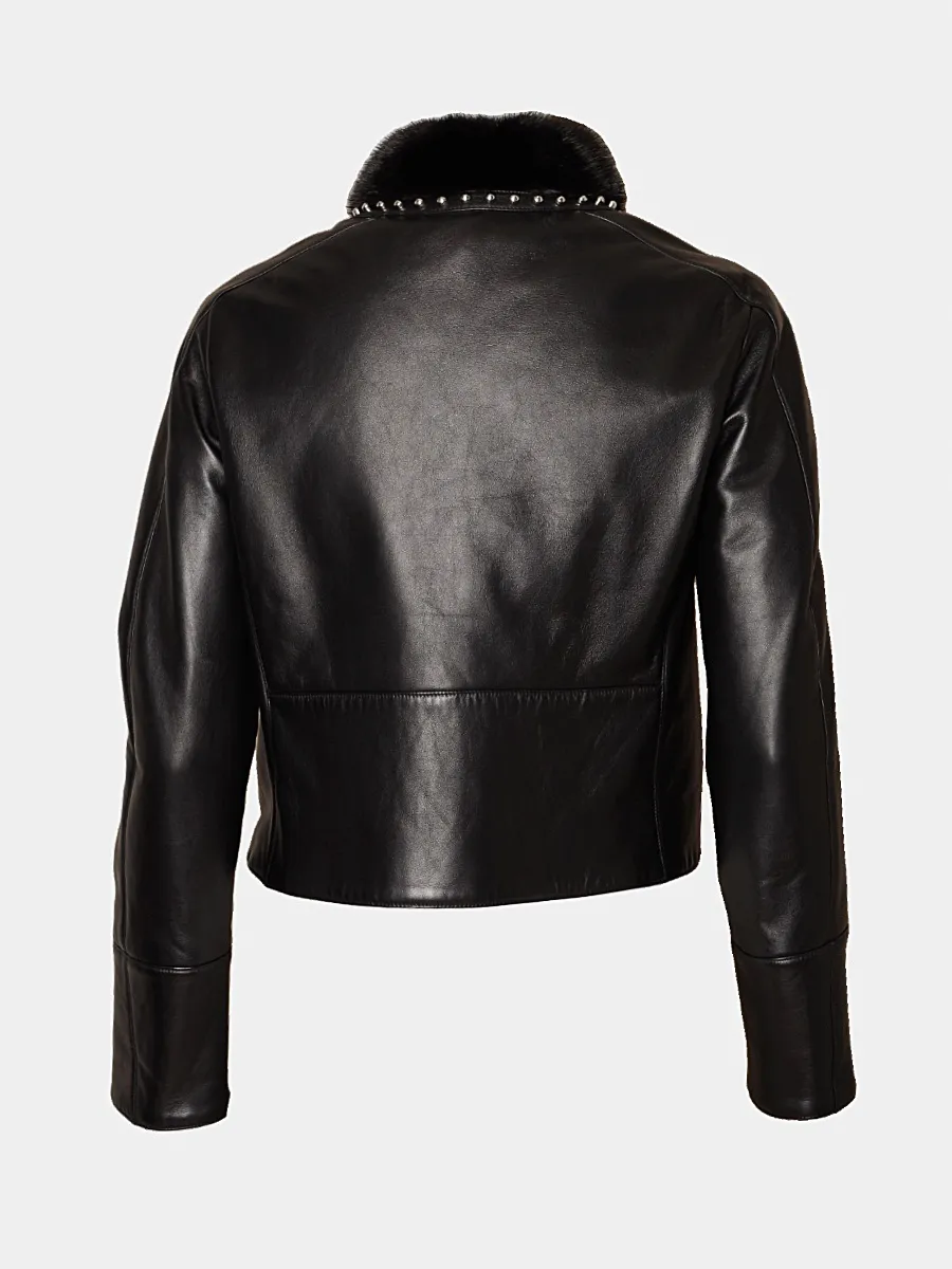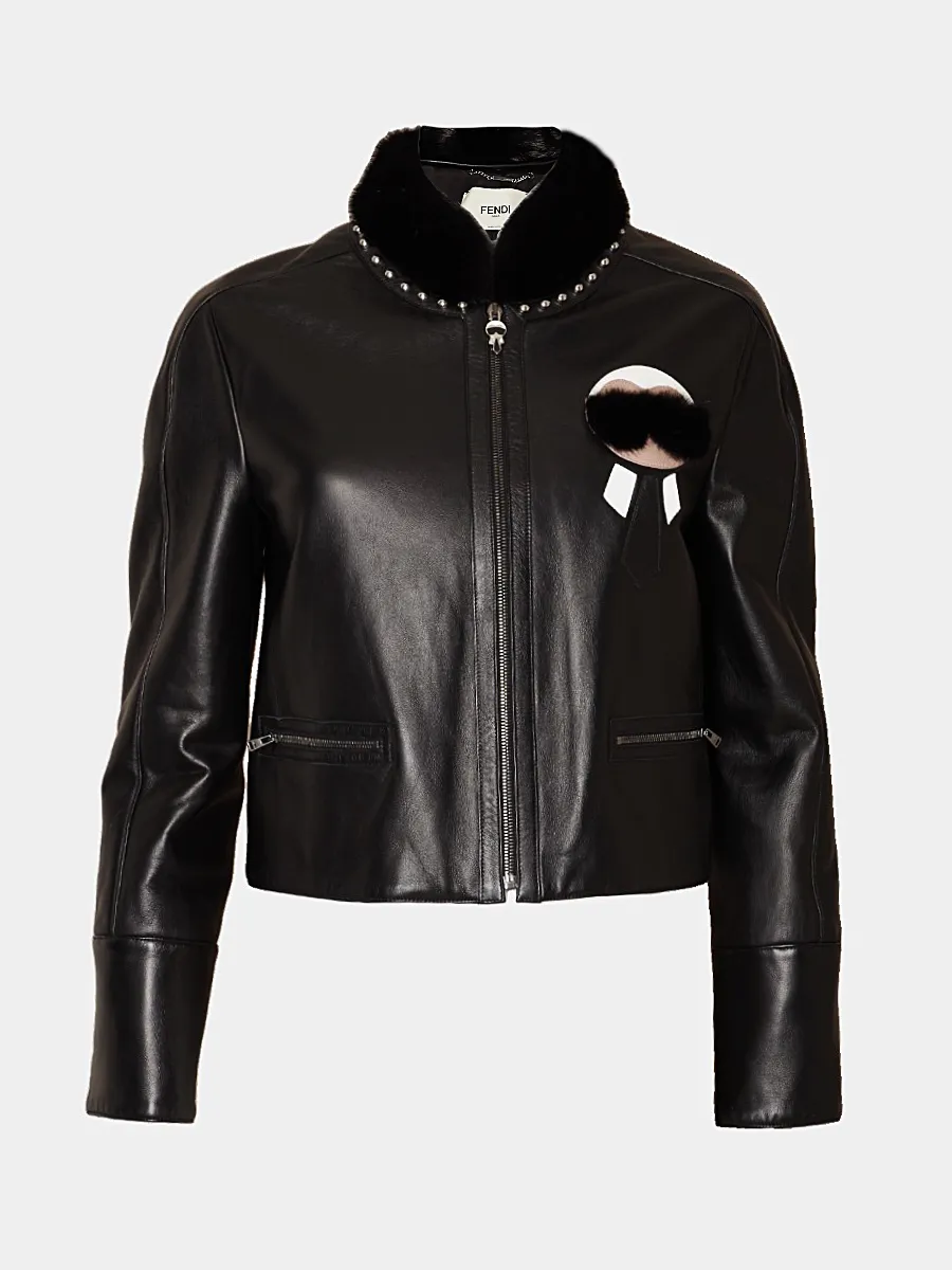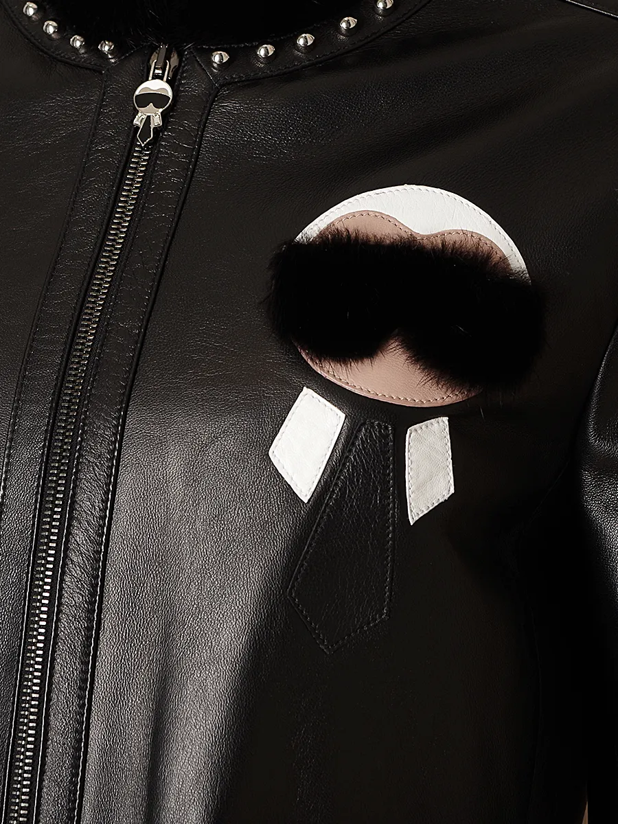 Куртка Fendi выполнена из качественной черной матовой кожи с контрастным меховым воротником и декоративными металлическими заклепками. Модель дополнена оригинальным принтом в виде объемного логотипа бренда, выполненном из комбинации кожи и меха, а также двумя накладными карманами на молниях. Удобная застежка-молния с фирменной пуговицей завершает стильный дизайн — идеальный выбор для современного городского стиля.
