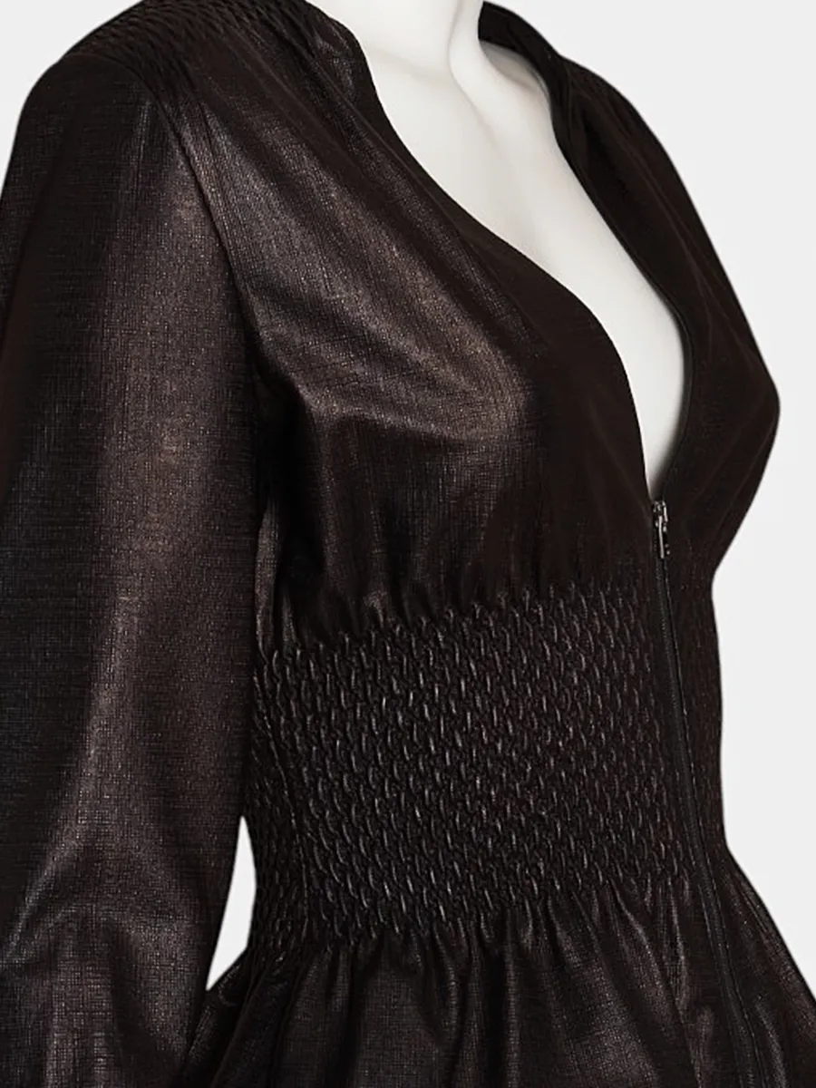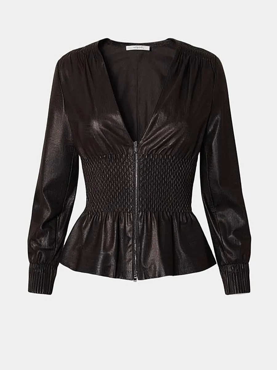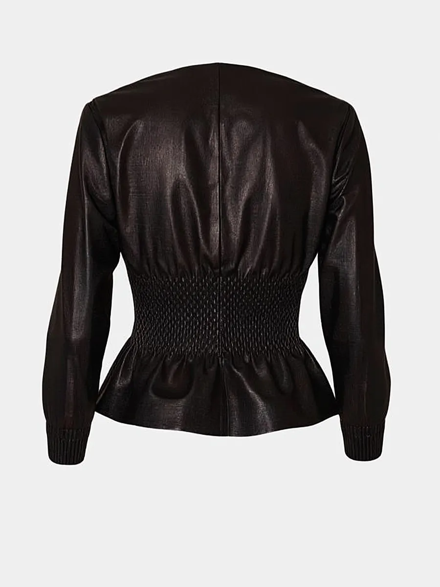 Куртка Fendi выполнена из темной, глянцевой ткани, напоминающей кожу или искусственный материал с блестящим эффектом. Дизайн куртки сочетает в себе современные и структурные элементы, что делает ее стильной и элегантной.