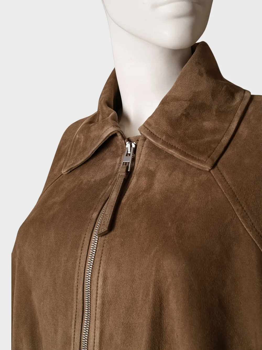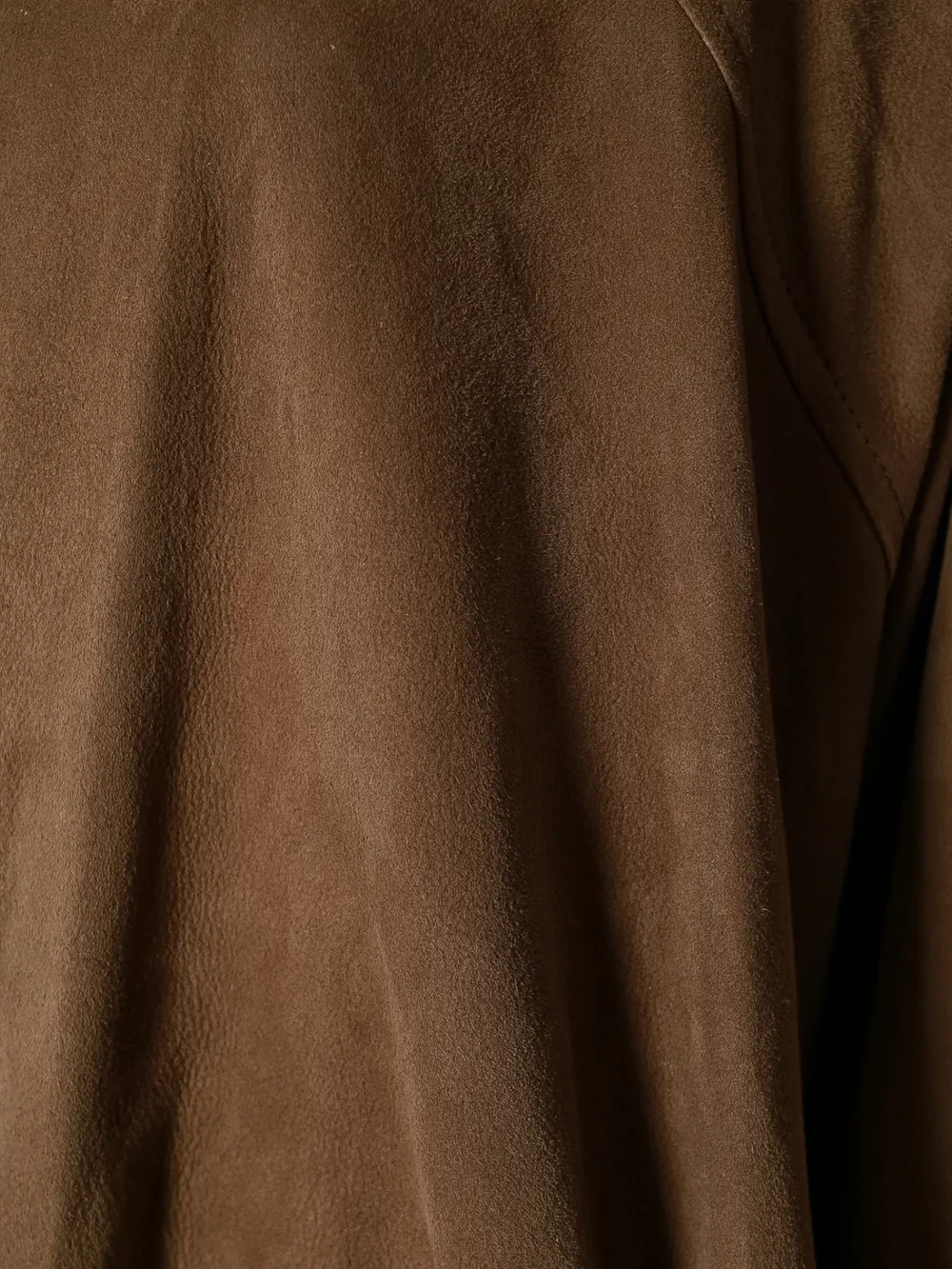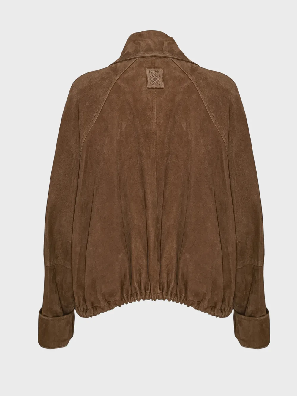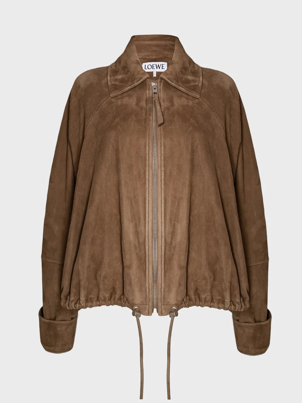 Куртка выполнена из качественного коричневого материала с гладкой текстурой, обеспечивающей комфорт и стильный внешний вид. Дизайн лаконичный и универсальный, акцентирован брендовым логотипом "LOEWE" на воротнике и спинке. Модель оснащена молнией спереди, воротником-стойкой и регулируемыми шнурками на талии для создания комфортного силуэта. Прочный материал и качественная отделка гарантируют долговечность и презентабельный внешний вид. Идеально подходит для прохладных дней или как базовый элемент гардероба.