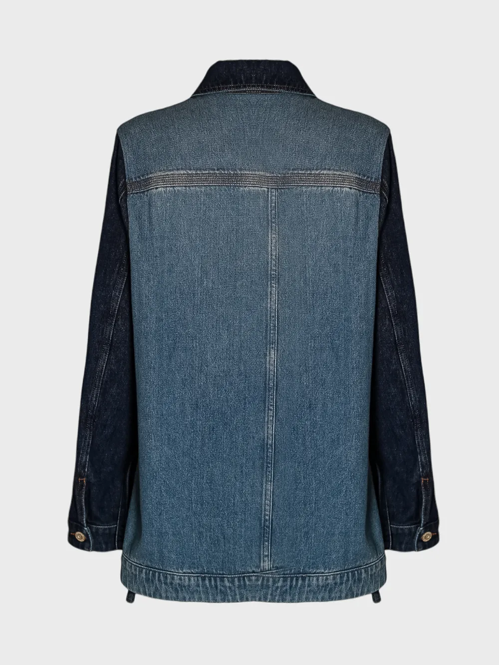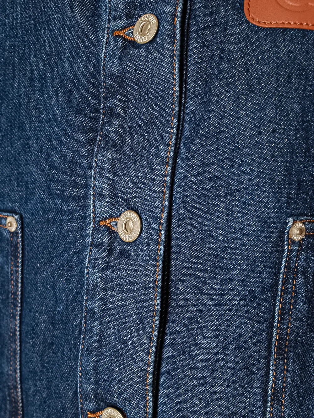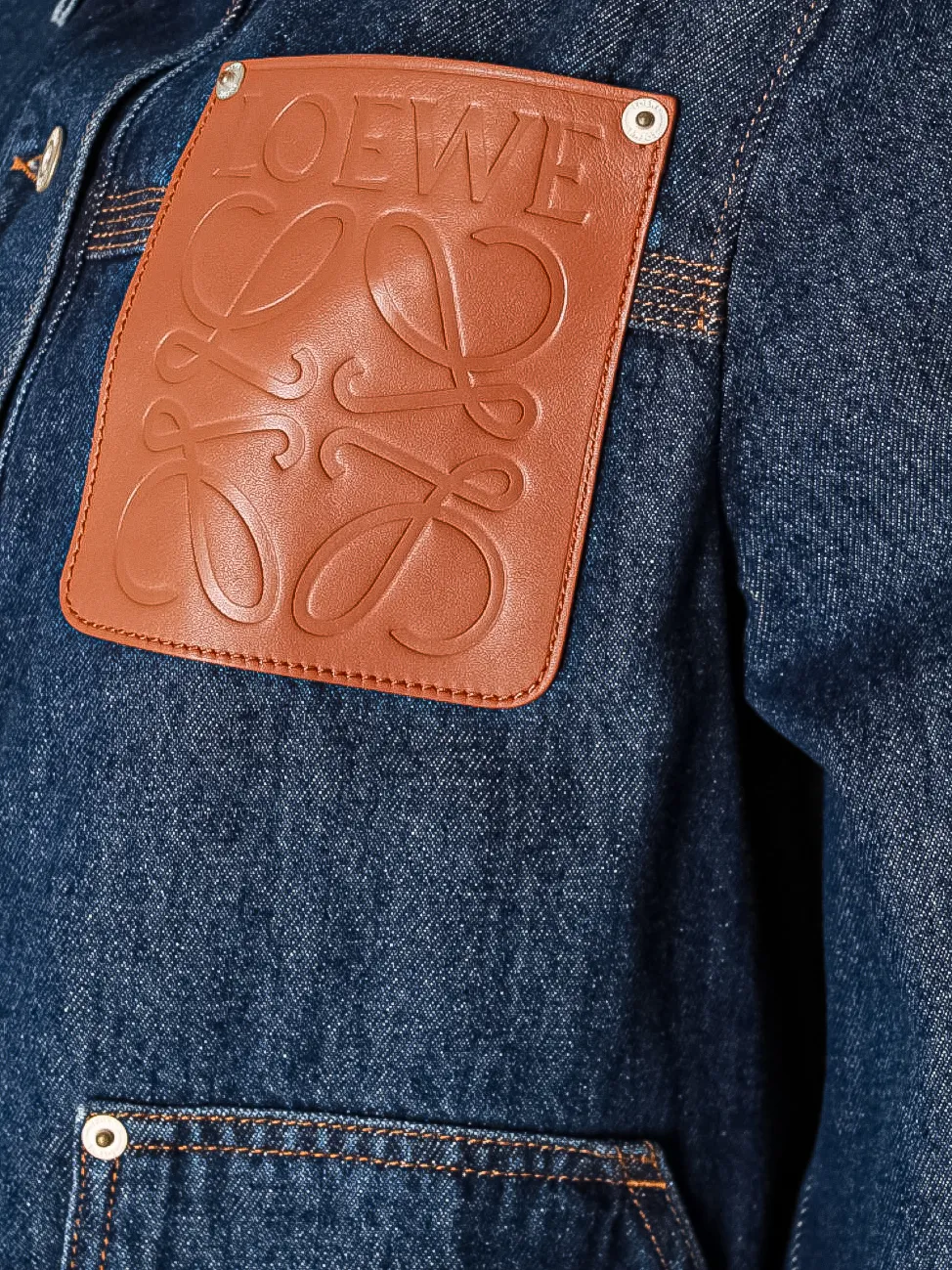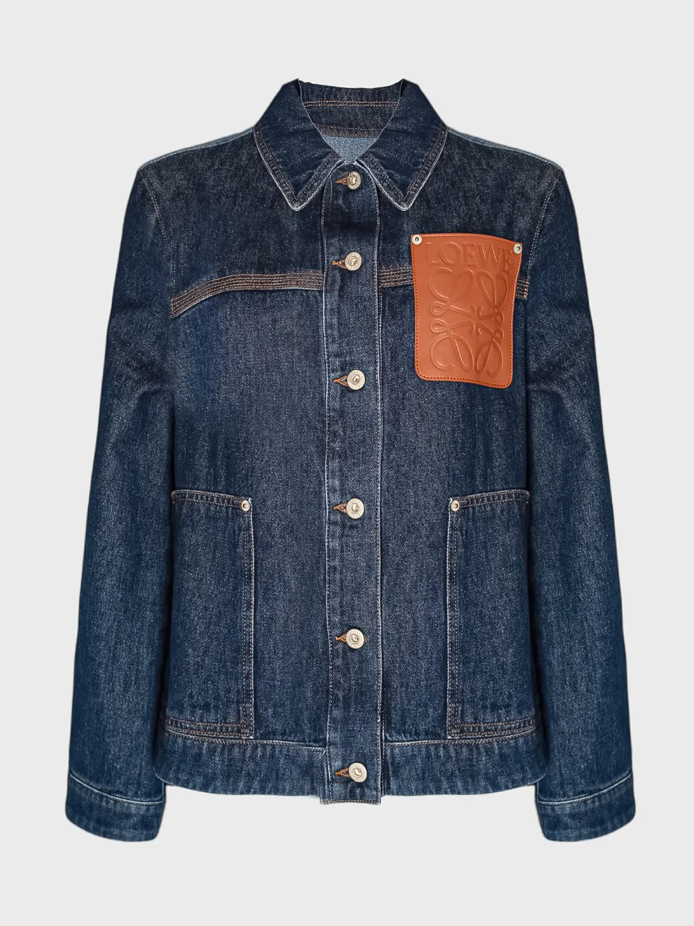 Элегантная куртка от премиального бренда Loewe выполнена из качественного темно-синего денима с эффектом потертости, придающим изделию утонченный вид. Модель дополнена контрастной коричневой кожаной нашивкой с выгравированным логотипом бренда на груди и металлическими кнопками с фирменным дизайном. Классический крой и продуманные детали делают эту куртку универсальным предметом гардероба для повседневного стиля.