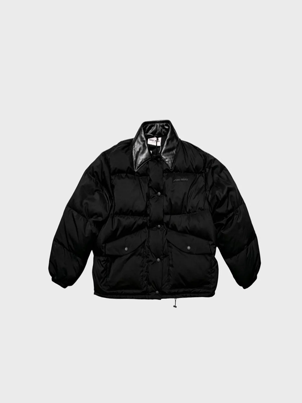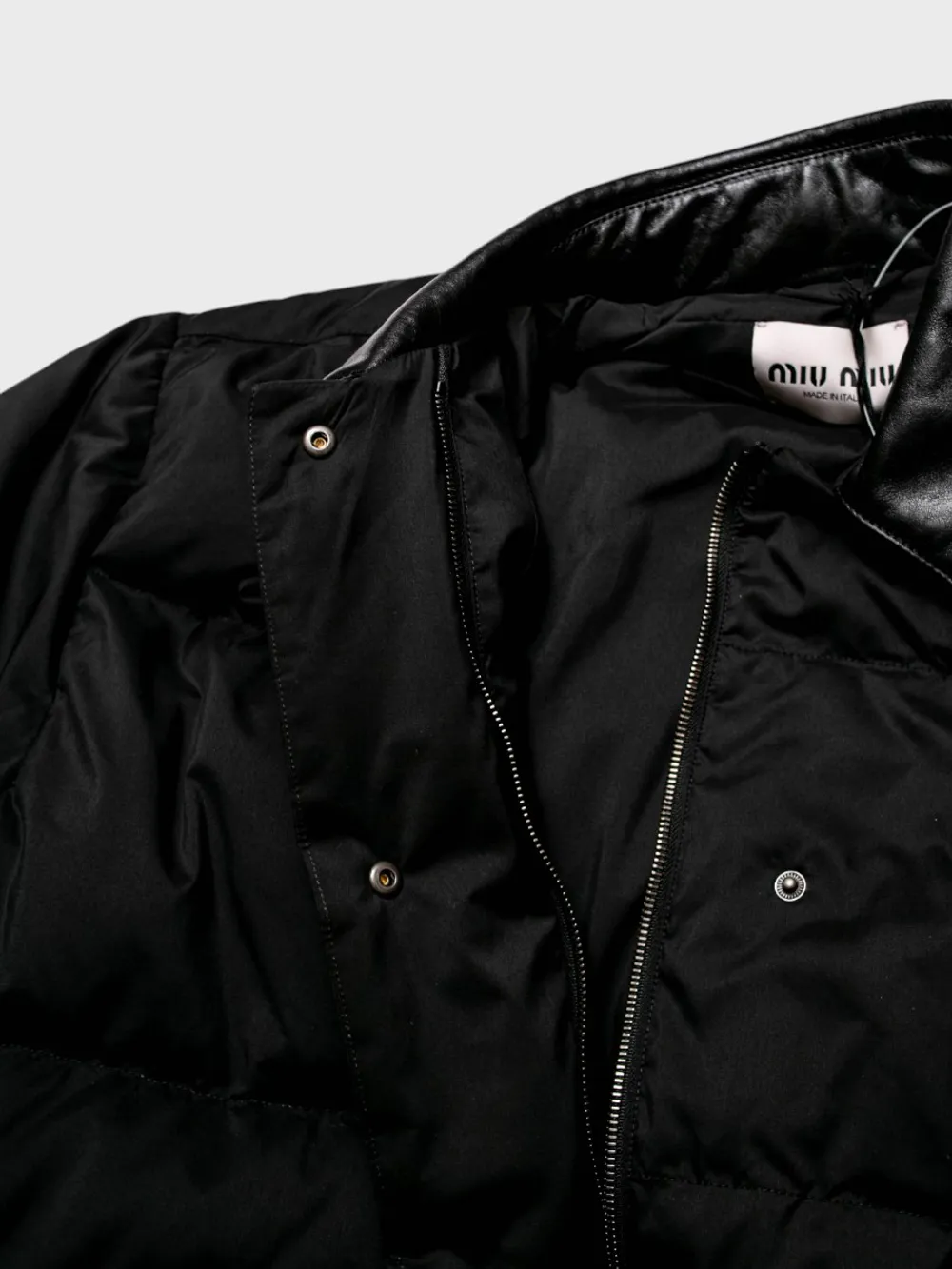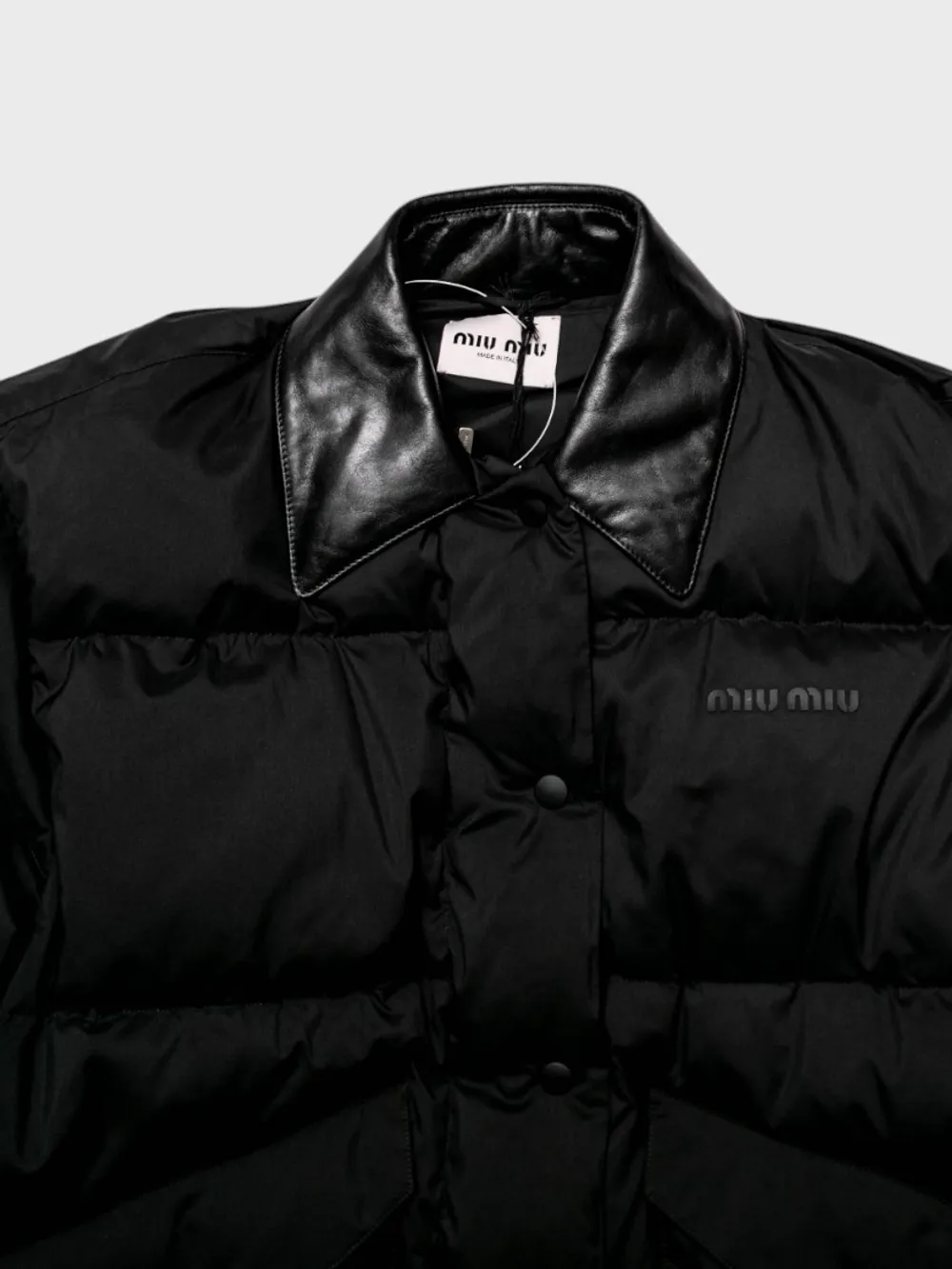 Куртка Miu Miu выполнена из гладкой водонепроницаемой ткани с контрастной стёганой фактурой, сочетает минималистичный черный цвет и узнаваемый логотип бренда на груди; модель с отложным воротником, застежкой на пуговицы и объемными рукавами — стильная и теплая деталь для утончённых городских образов.