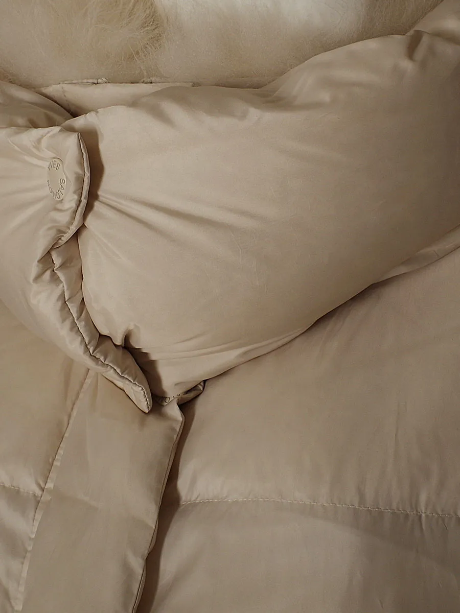 • Состав: Ткань: 68% полиэстер 26% вискоза 6% эластан Подкладка: 100% полиэстер Набивка: 95% утиный пух 5% утиное перо Ворот: 100% ягненок