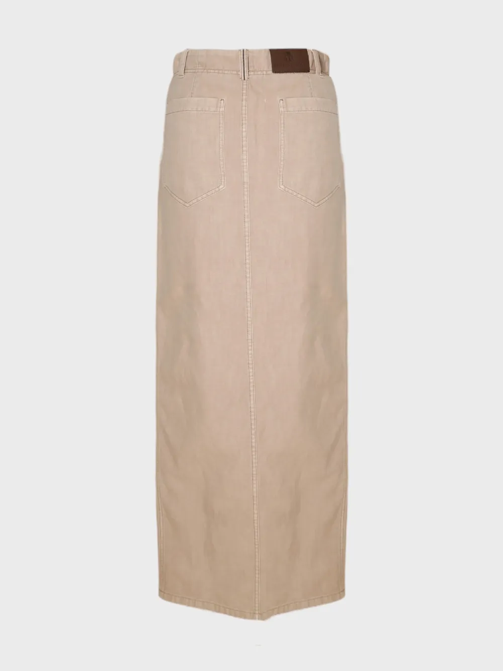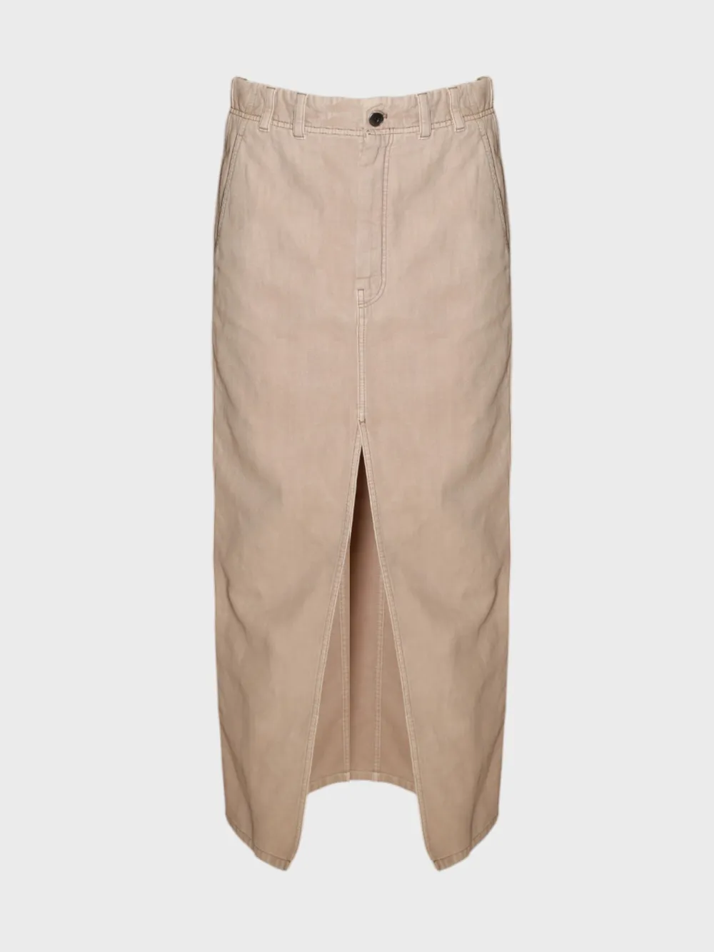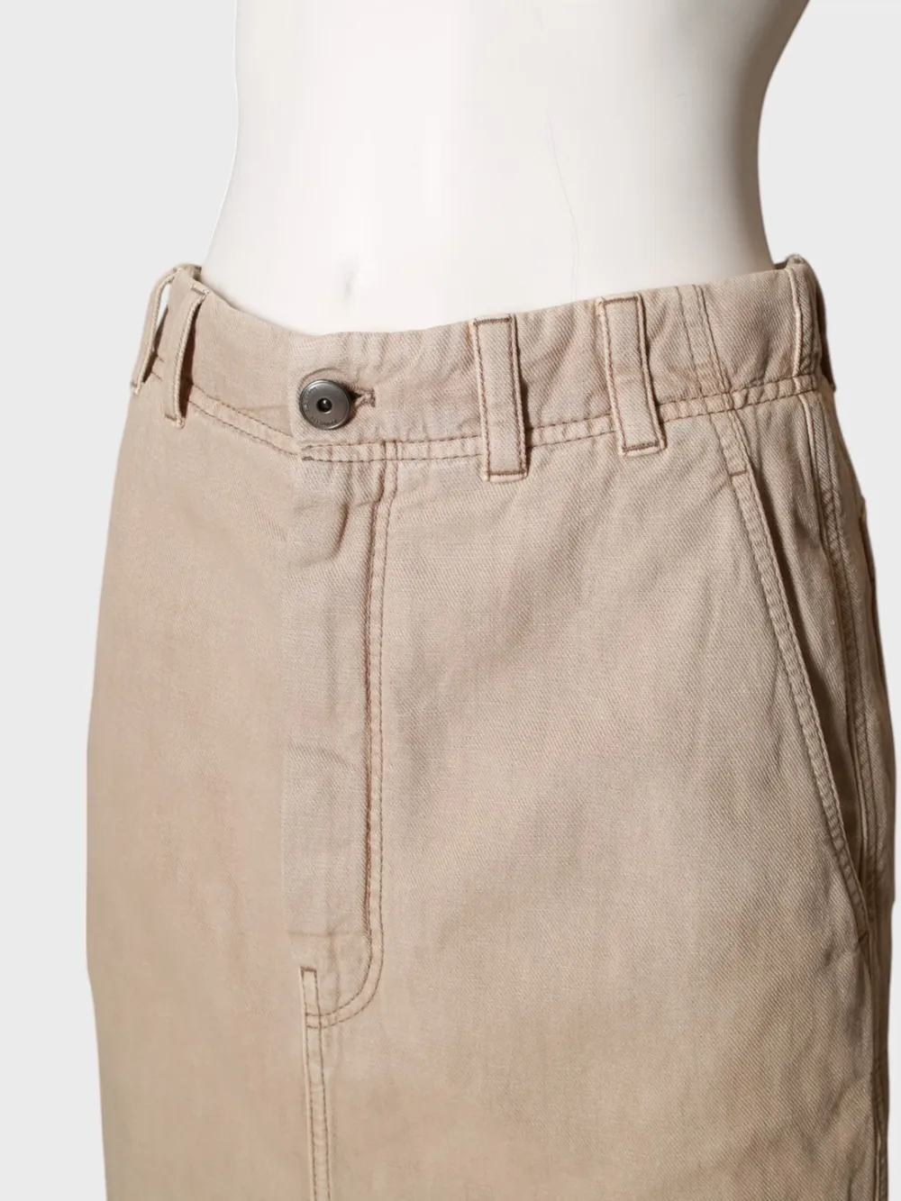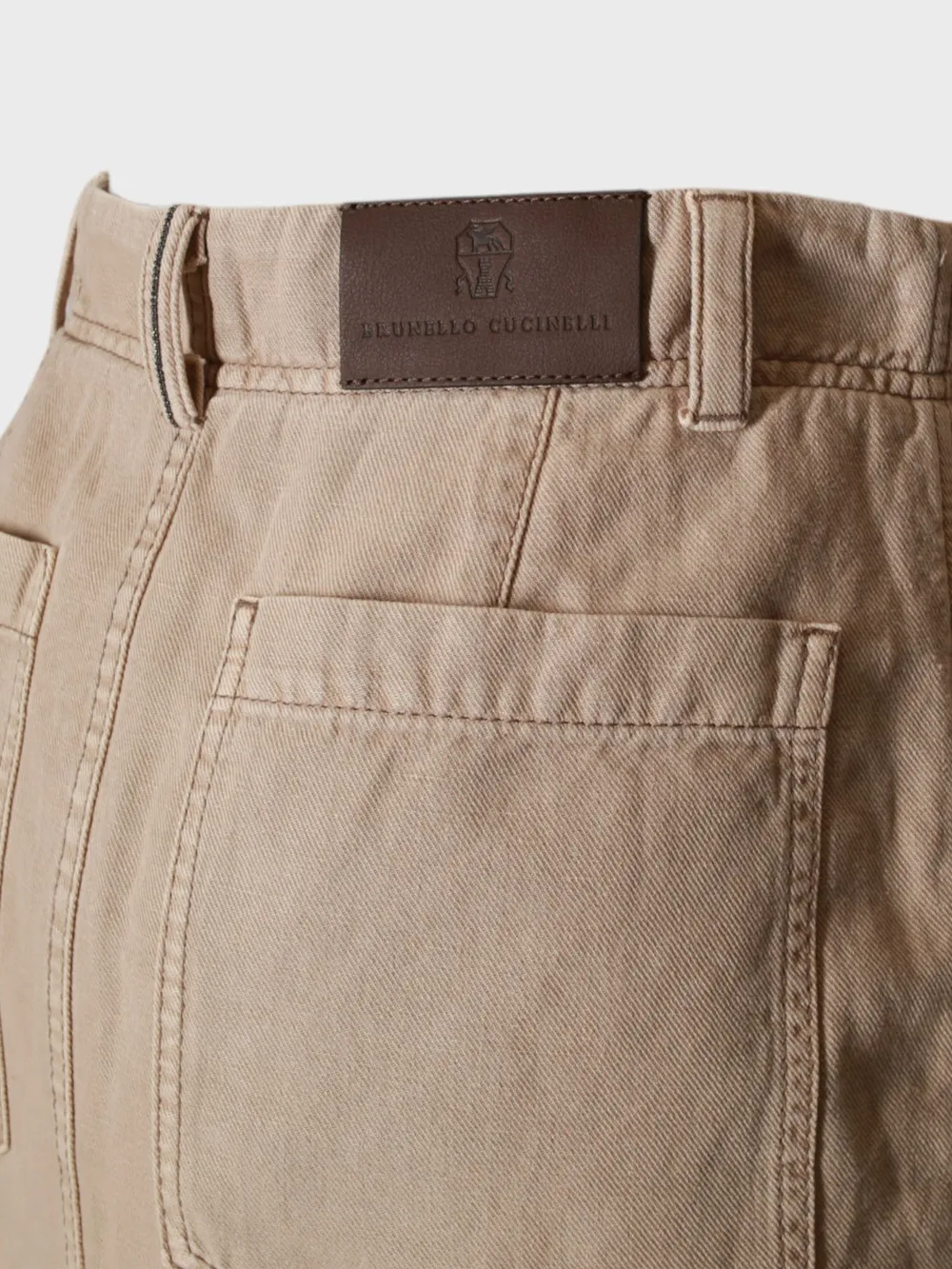Юбка Brunello Cucinelli выполнена из плотной ткани бежевого оттенка, сочетает прямой крой, высокую посадку и центральный разрез спереди; дополнена двумя задними карманами и кожаной этикеткой с логотипом бренда — элегантный и универсальный элемент гардероба в стиле утончённого минимализма.