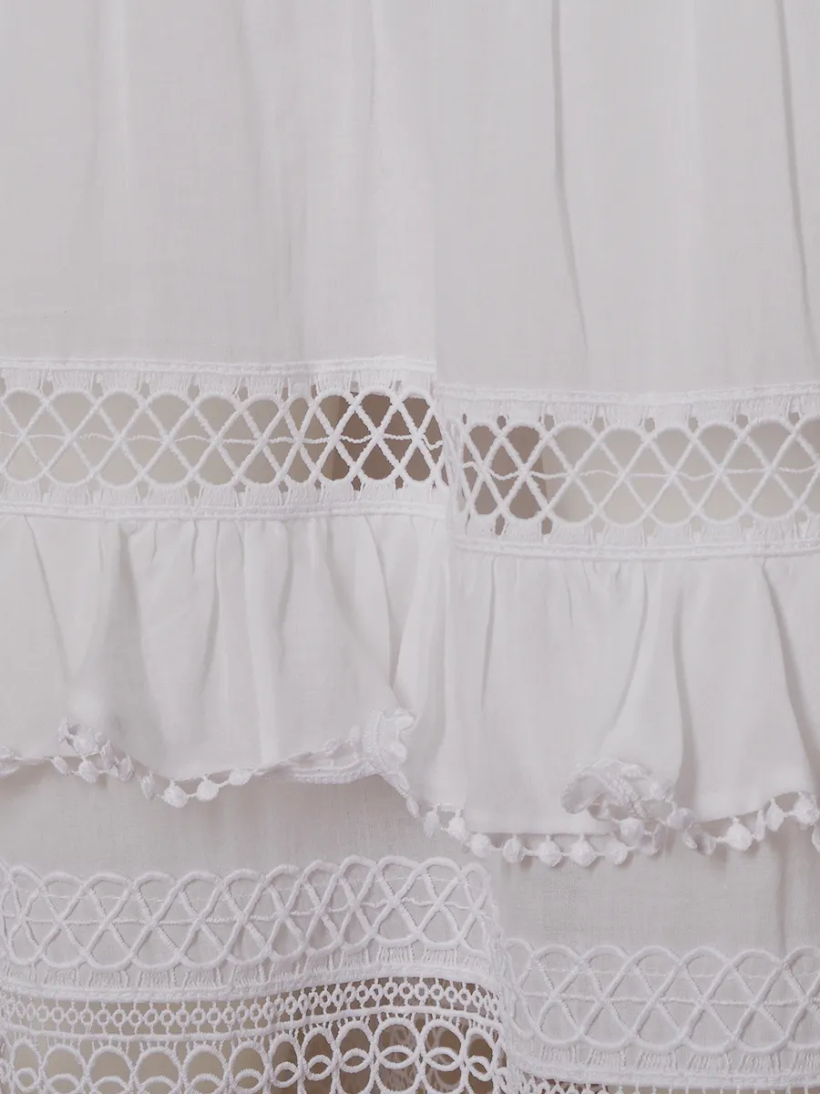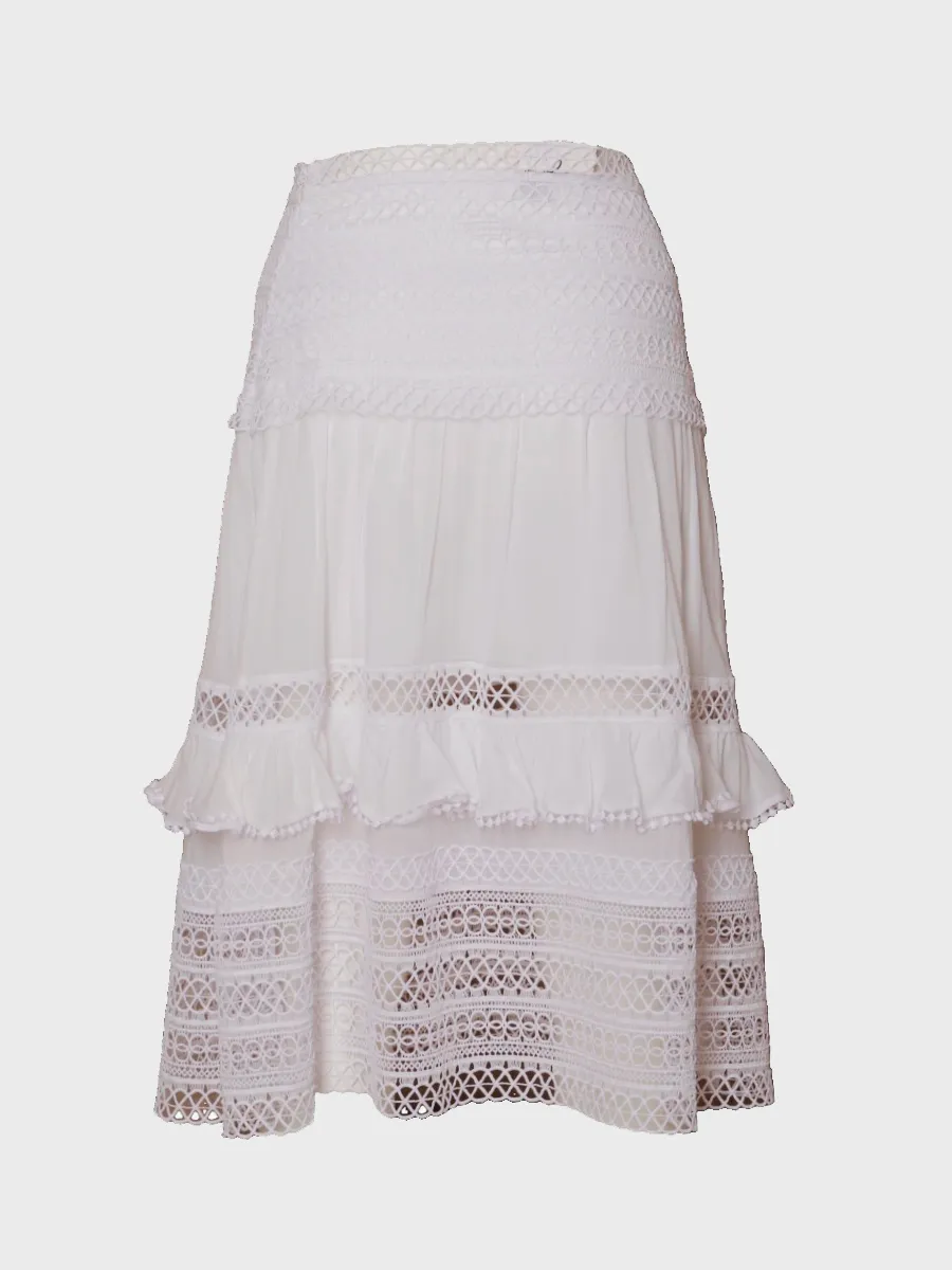 Юбка Charo Ruiz выполнена из белого трикотажа с нежным кружевным декором. Модель сочетает прямой силуэт и многослойную структуру, дополненную рюшами и перфорированным узором. Высокий пояс и плавные складки создают элегантный образ, а тонкая фактура материала придает изделию легкость и воздушность. Идеально для летних мероприятий или повседневного использования в теплую погоду.