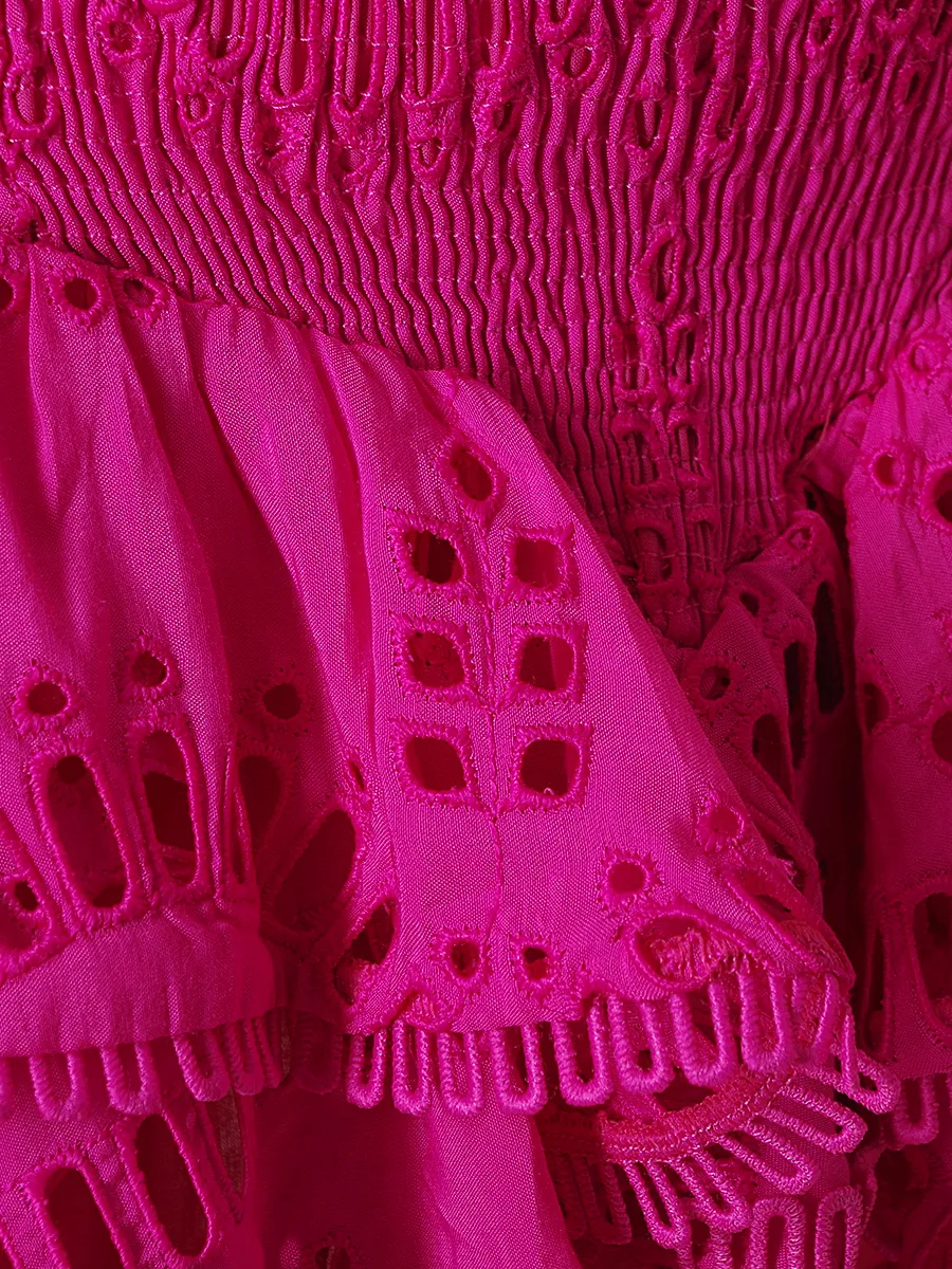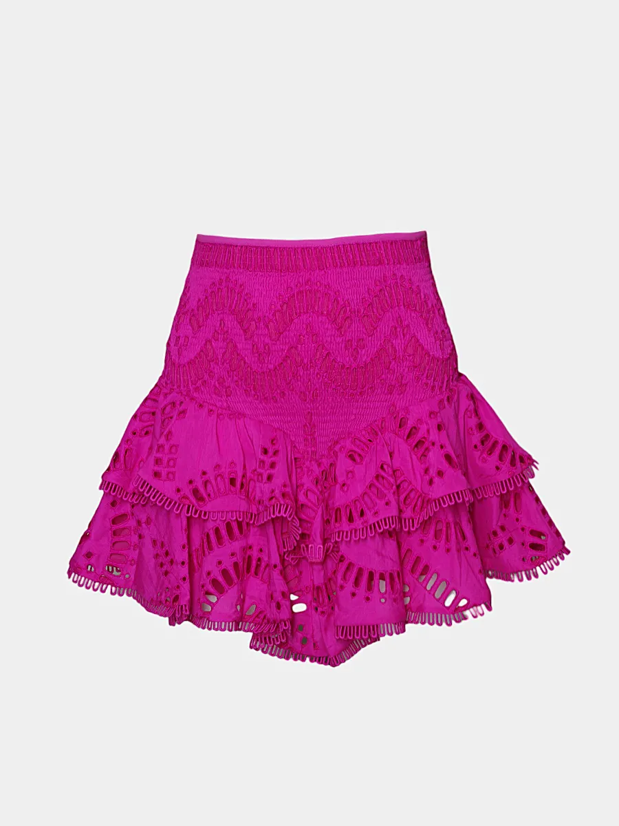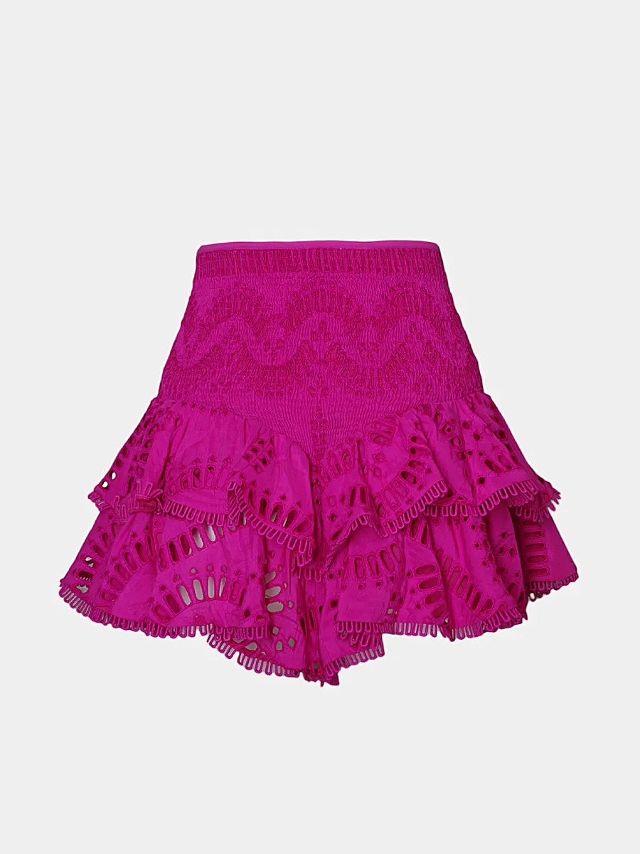 Юбка Charo Ruiz выполнена из ярко-розового кружевного трикотажа с рельефным узором, созданным методом перфорации. Модель сочетает высокий эластичный пояс и многослойную юбку с пышными складками, декорированную тонкой отделкой. Легкая фактура материала придает изделию воздушность и нежность. Идеально для летних мероприятий или повседневного использования в теплую погоду.