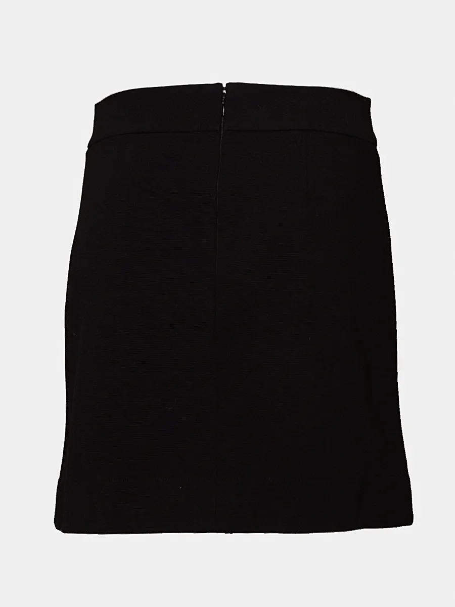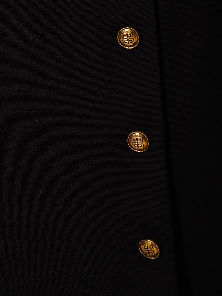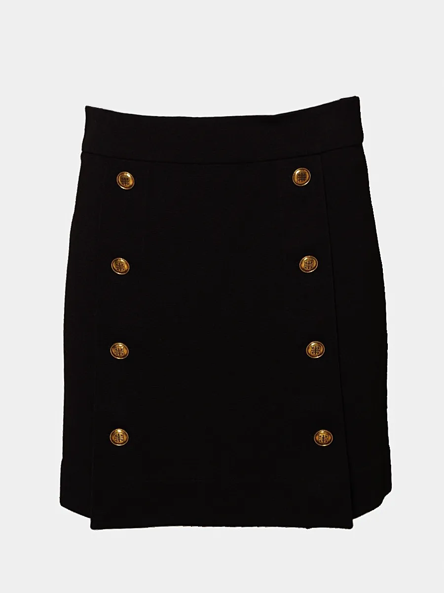 Юбка Givenchy выполнена из плотной черной ткани с четкой посадкой и строгим силуэтом. Модель дополнена декоративными золотыми пуговицами с фирменным логотипом бренда, расположенными вдоль центральной застежки, что придает изделию характерный военно-морской стиль. Прямой крой и высокая посадка создают эффектную пропорцию фигуры — универсальный вариант для делового или вечернего образа.